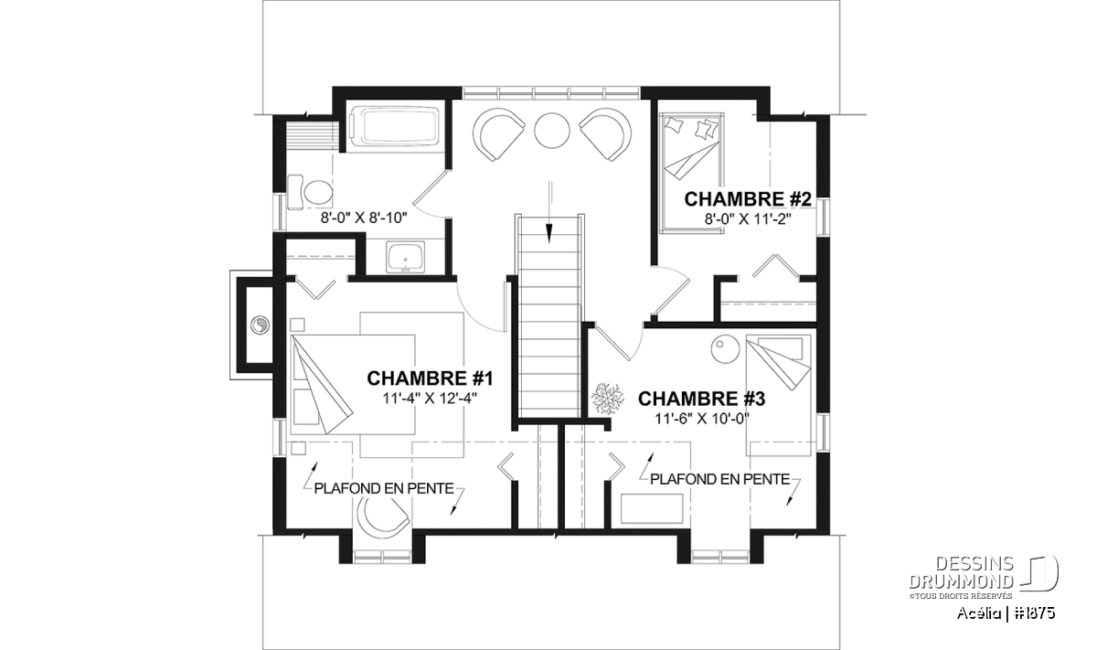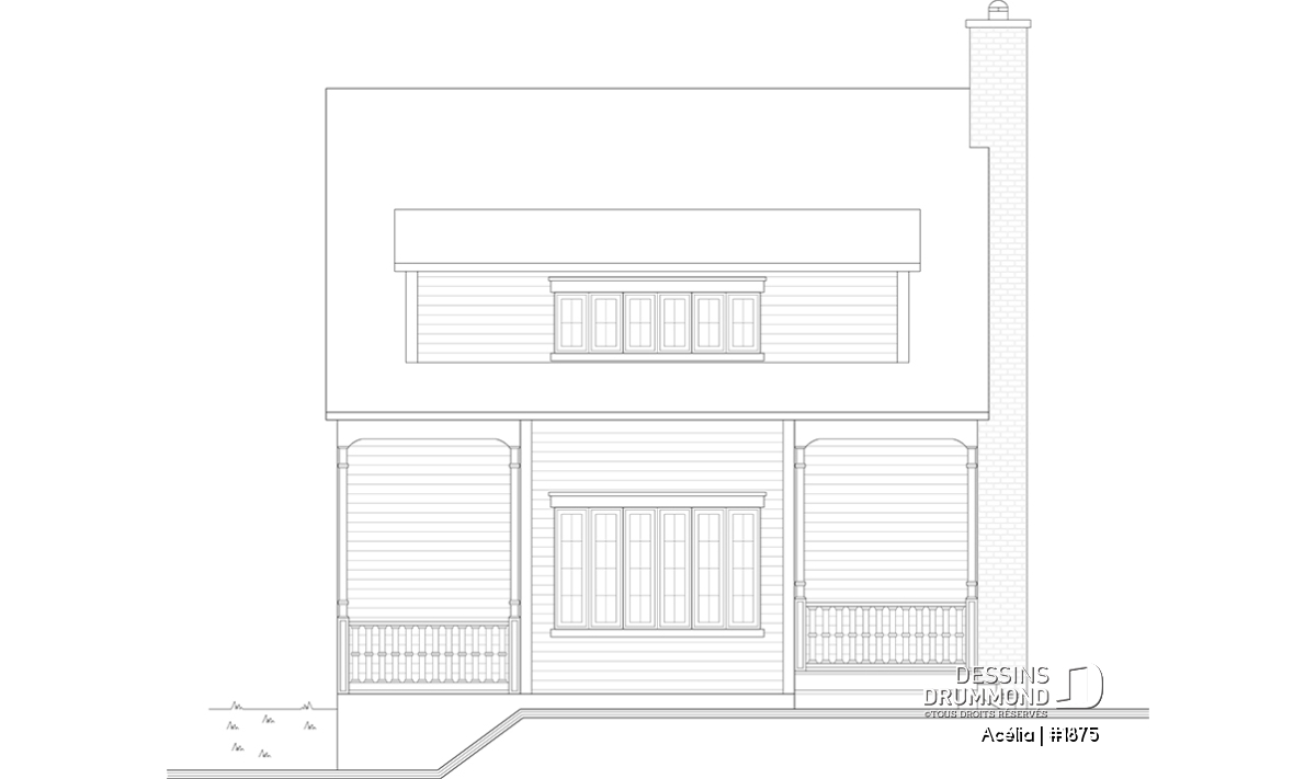 Plan de maison canadienne 3 chambres, avec lucarnes, foyer au salon, buanderie au premier, boudoir