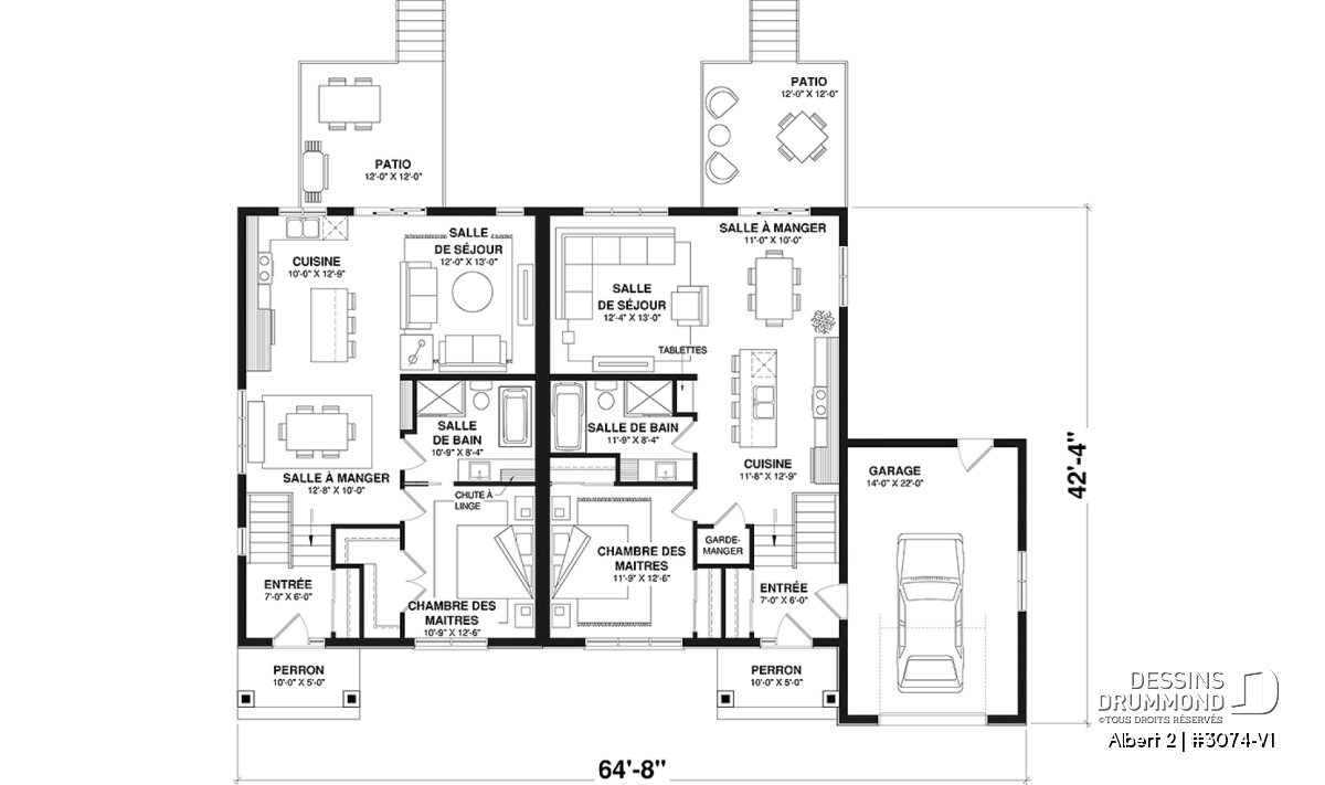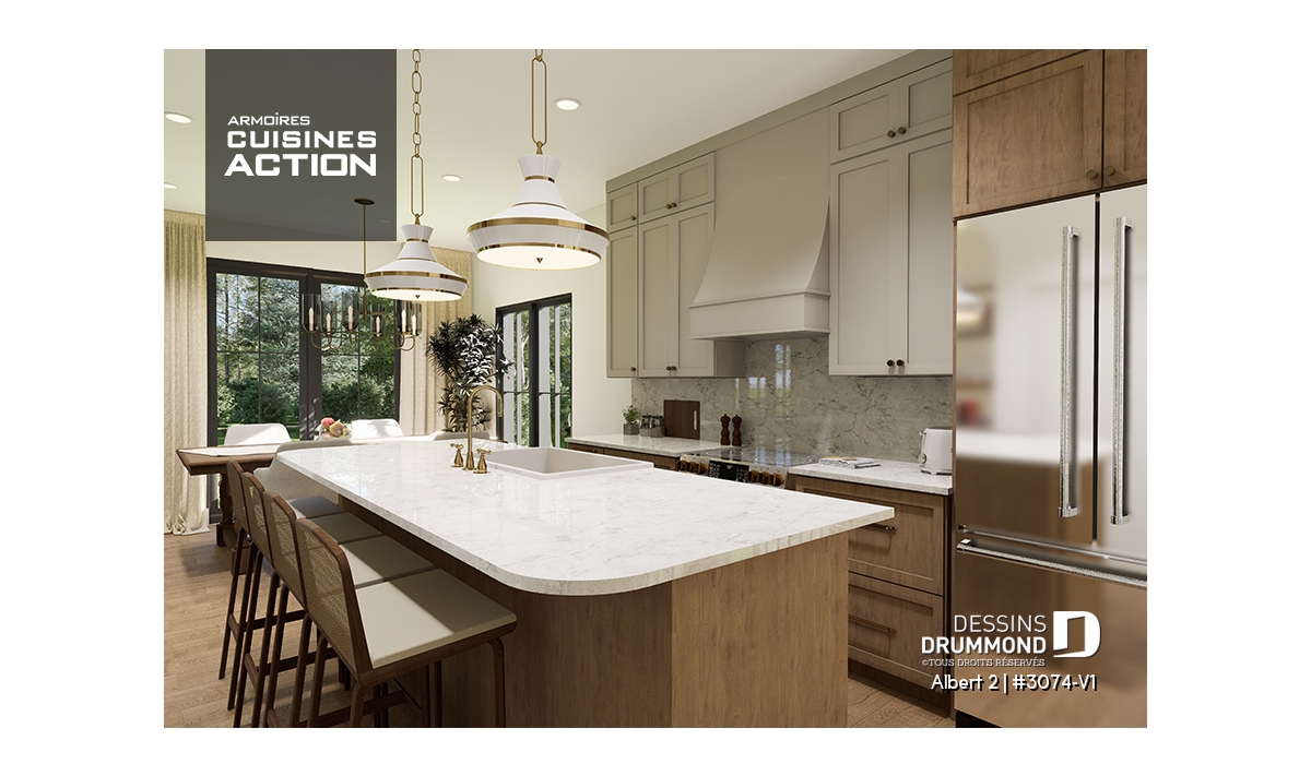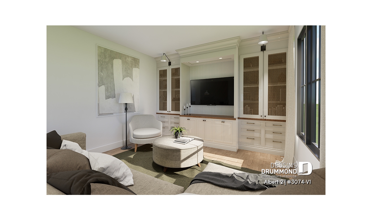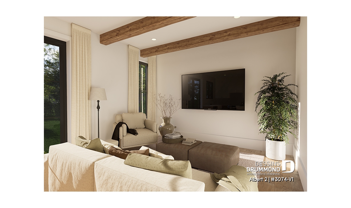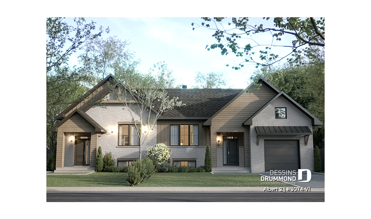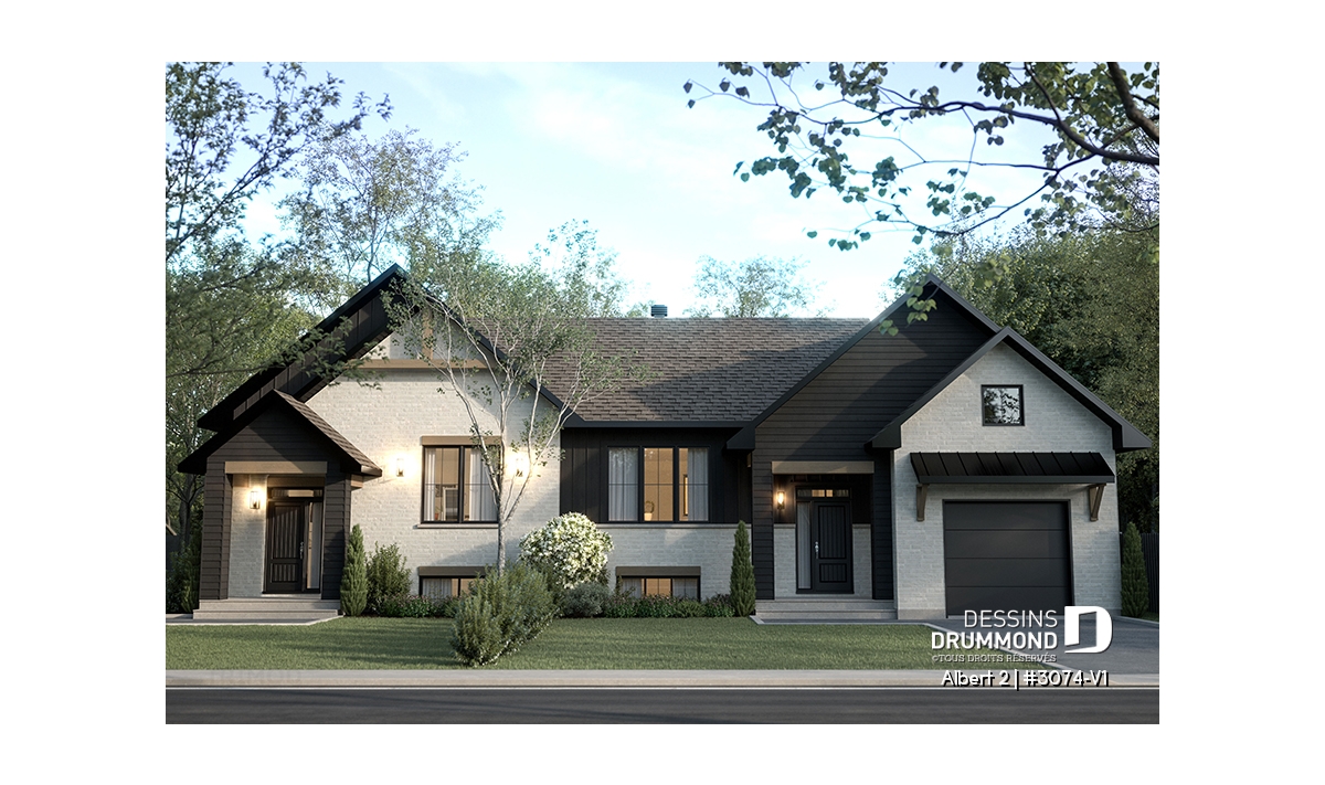 Le plan de maison ALBERT 2 (plan de jumelée #3074-V1) propose un total de 3600 pi.ca. aménagés au rez-de-chaussée et au sous-sol entièrement fini. Chacun des logements comporte donc 1800 pi.ca. aménagés au rez-de-chaussée et sous-sol fini. La grande différence versus son modèle d'origine (ALBERT) réside dans le garage qui a été ajouté à l'unité de droite. Le style moderne et rustique à la fois saura attirer l’œil autant à la campagne que dans les nouveaux quartiers résidentiels! À noter aussi que les deux logements proposent des plafonds à 9' de hauteur au plancher principal.