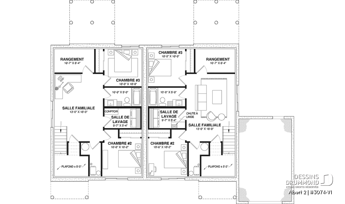 Les sous-sols sont identiques et regroupent chacun 2 chambres secondaires, une salle de bain, la salle de lavage et un coin rangement. Au besoin nous pouvons modifier les planchers afin d'accommoder les besoins particuliers de votre famille.