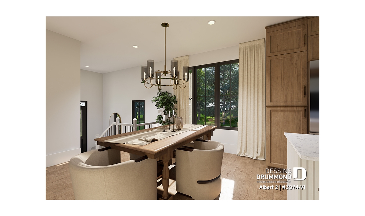 La cuisine avec îlot est ouverte sur le salon et ces deux espaces sont à l'arrière de la maison, pour le logement à gauche (1). La salle à dîner est centrale pour le logement 1, et à l'arrière de la maison pour le logement 2. Ce dernier offre un aménagement différent du rez-de-chaussée ce qui nous a permis d'ajouter un garde-manger (toujours au logement 2).