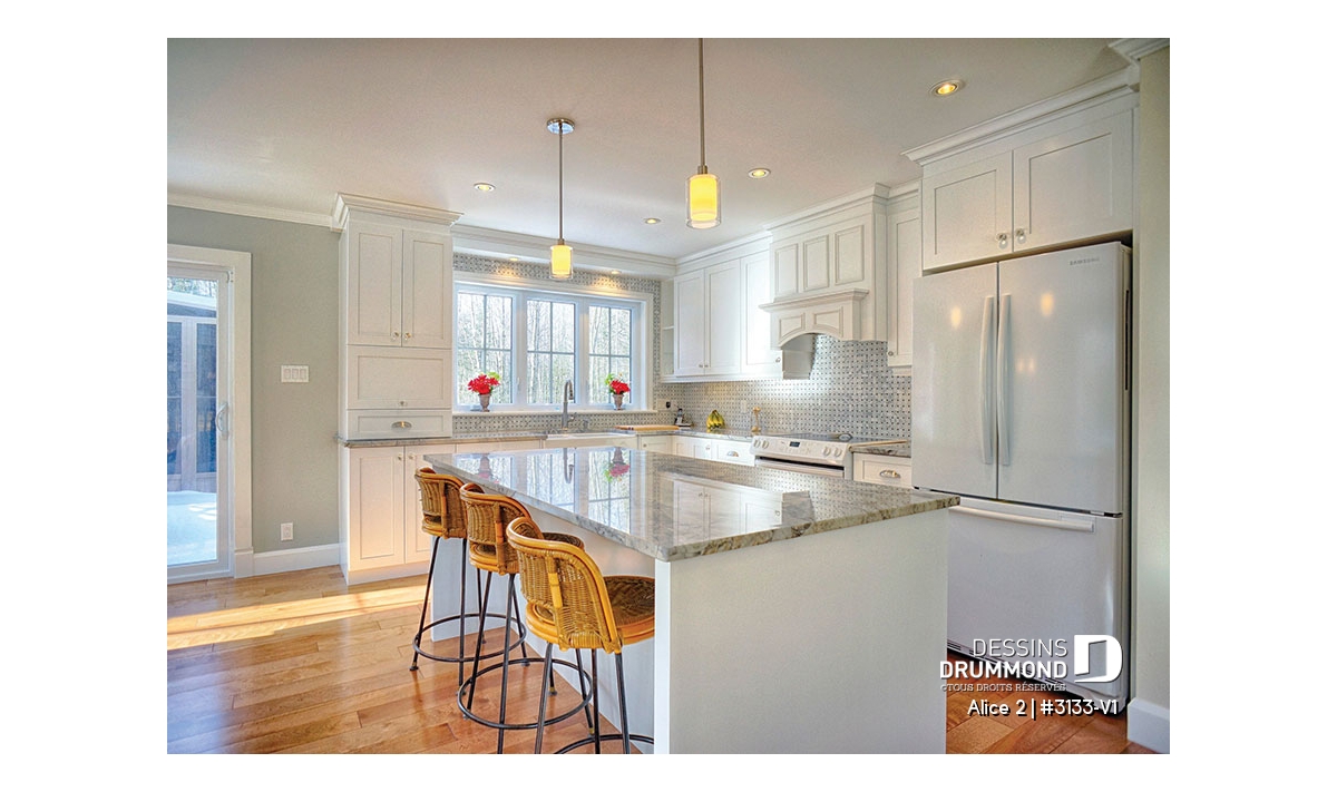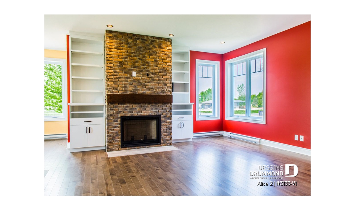 Bien entendu, cette approche « boomer » se caractérise aussi par l’addition d’un garage de très beau format avec porte de service à l’avant comme à l’arrière et escalier conduisant au sous-sol. Sans oublier, l’ajout de plus de 100 pi2 au rez-de-chaussée pour des pièces toutes plus confortables que sur le plan original ainsi qu’un secteur activités entièrement ouvert et abondamment fenêtré avec foyer en plein cœur de celui-ci. C’est aussi, une cuisine avec excellent rangement et îlot-lunch et une salle de bain avec vanité double, bain d’angle confortable et douche indépendante de 3pi x 6pi.