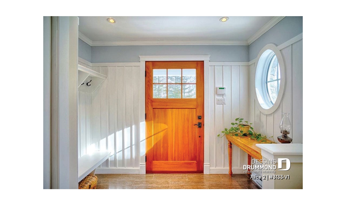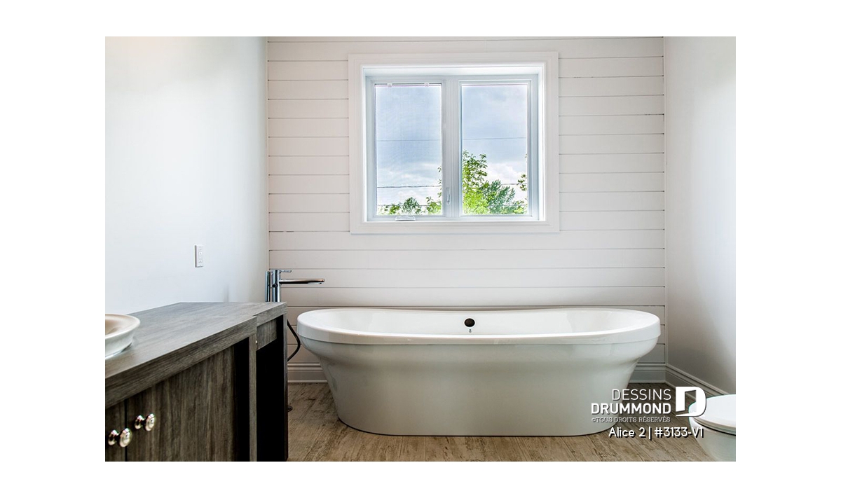 Voilà pourquoi, à l’intérieur, les trois chambres prévues au plan d’origine font place à un aménagement de deux chambres alors que la troisième chambre est ici convertie en véritable buanderie ou salle utilitaire dans laquelle un large comptoir avec cuve intégrée et un espace congélateur seront grandement appréciés.