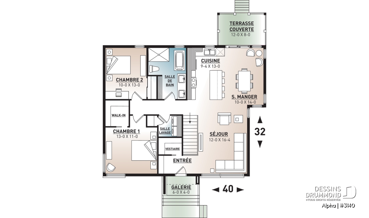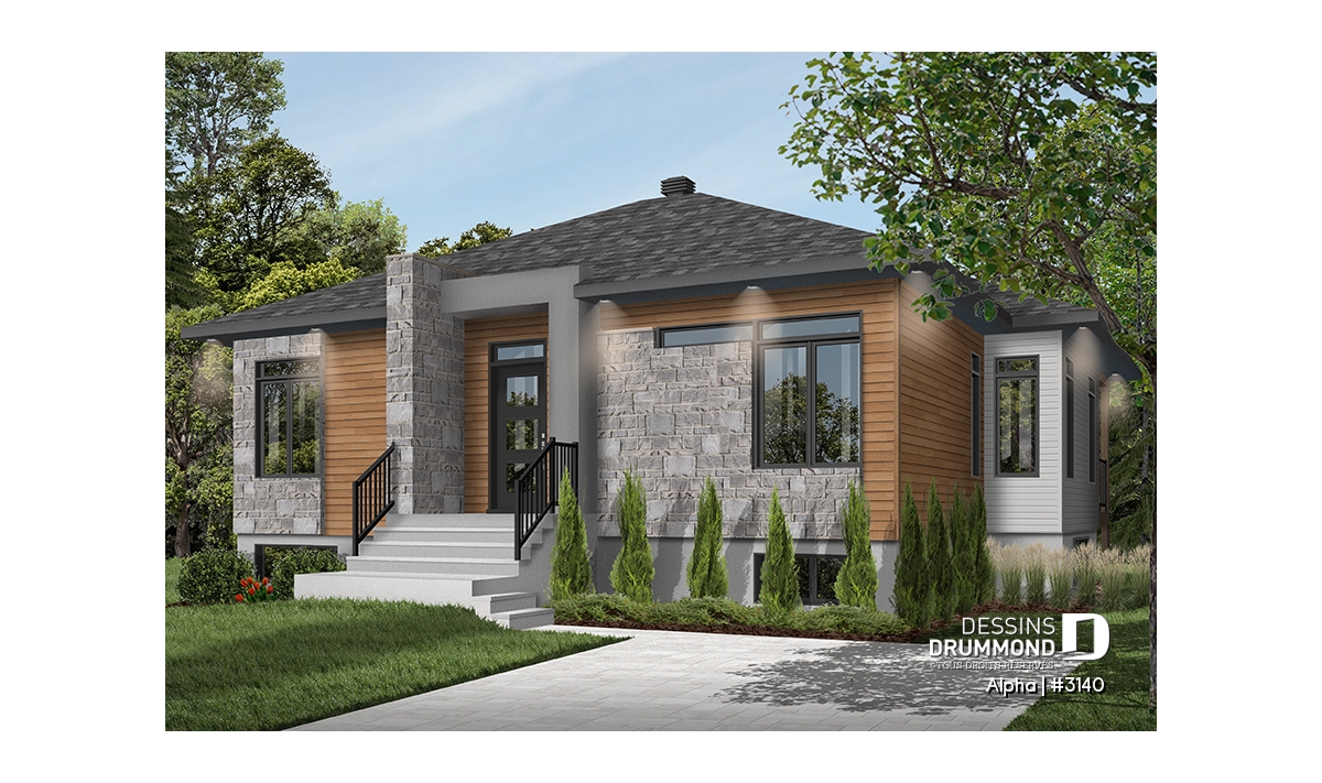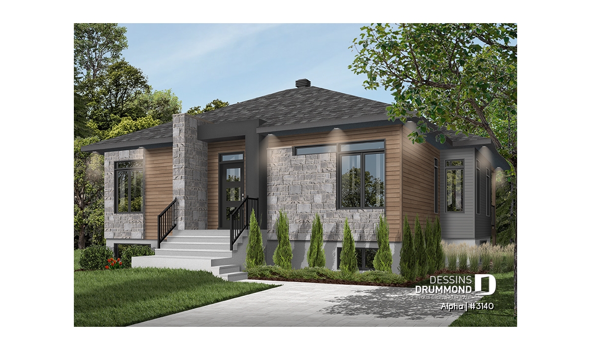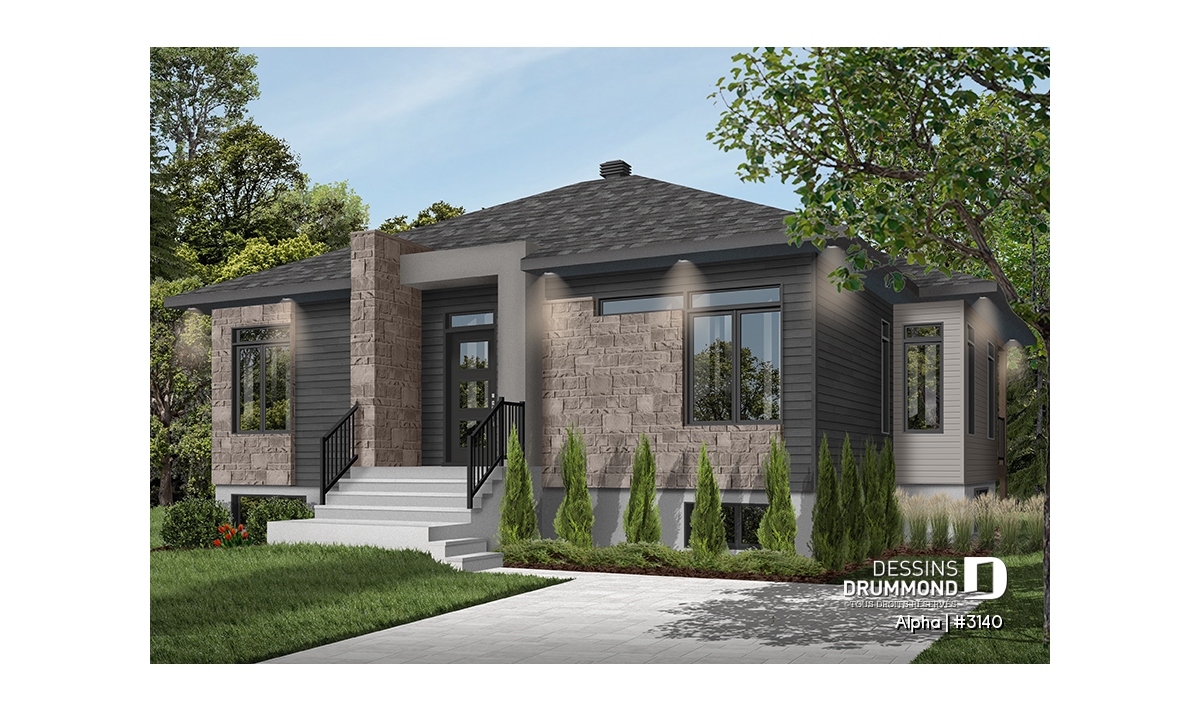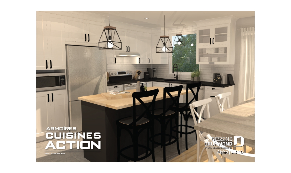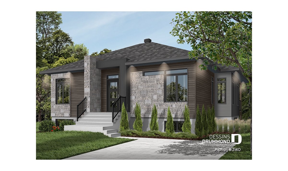 Le plan no. 3140 propose 2 chambres aménagées sur le même plancher (rez-de-chaussée, de 1207 pi. carrés. La chambre des parents, de format 13' x 11' a une grande garde-robe de type walk-in. Une grande salle de bain familiale avec bain et douche séparés, comporte une double pratique double vanité. Une buanderie aménagée près des chambres, sera pratique et fort appréciée. La cuisine est ouverte sur la salle à manger, et inclut une grande îlot pouvant recevoir facilement 4 invités. Un petit coin lecture est aménagé en retrait dans la salle à manger. Le salon de bon format est ouvert sur le secteur cuisine / salle à manger. L'entrée est spacieuse et possède une grande garde-robe walk-in ainsi qu'un coin permettant l'aménagement d'un petit banc et rangement supplémentaire. Le sous-sol de 1207pi.carré est à aménager. Nous pouvons réaliser les modifications que vous souhaitez à ce plan, simplement nous contacter pour votre estimé.
