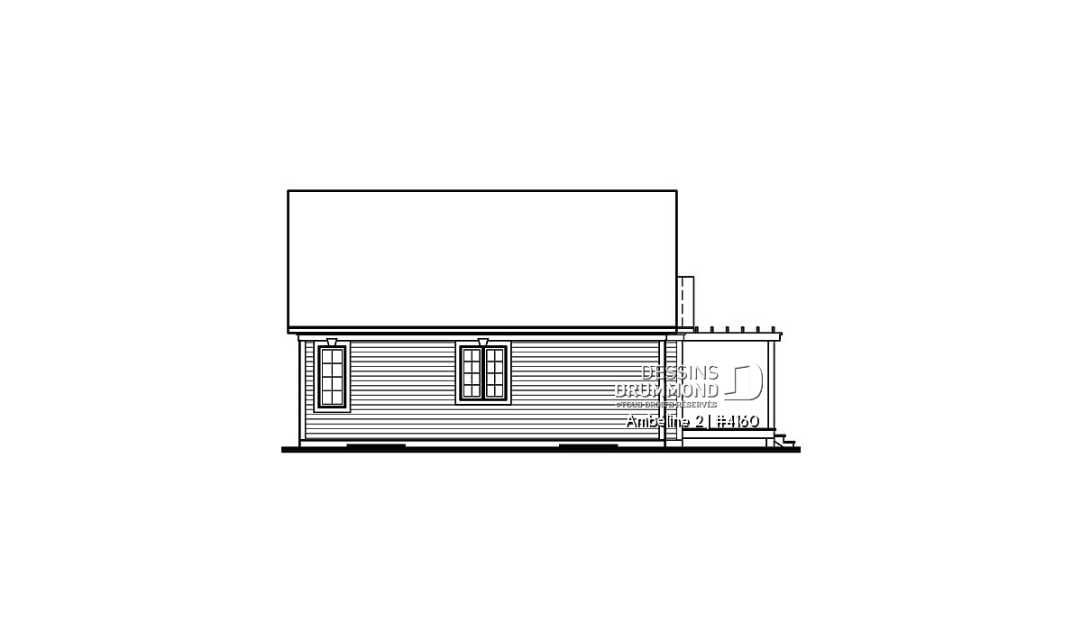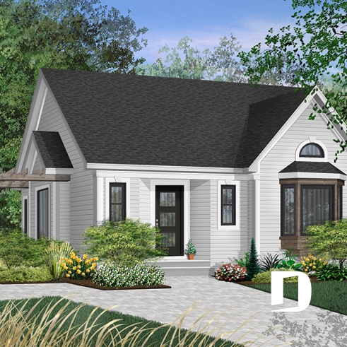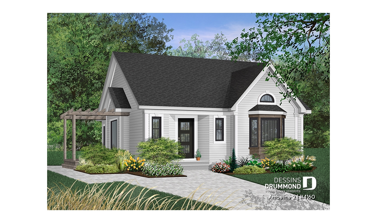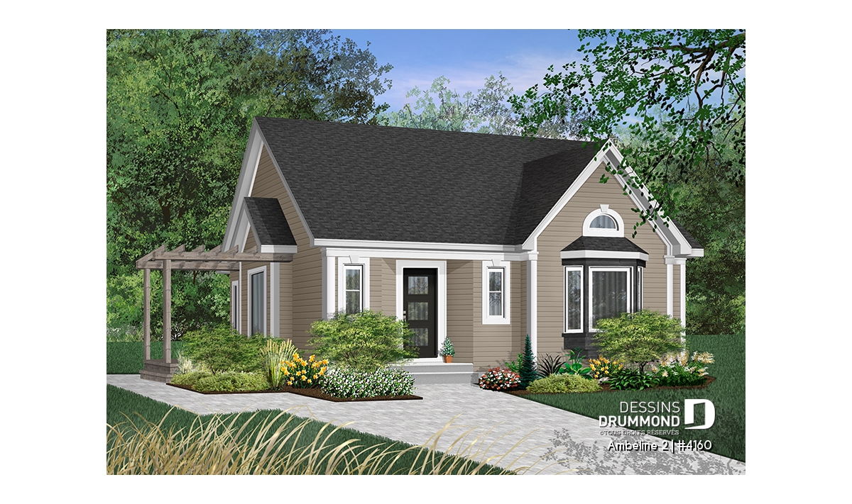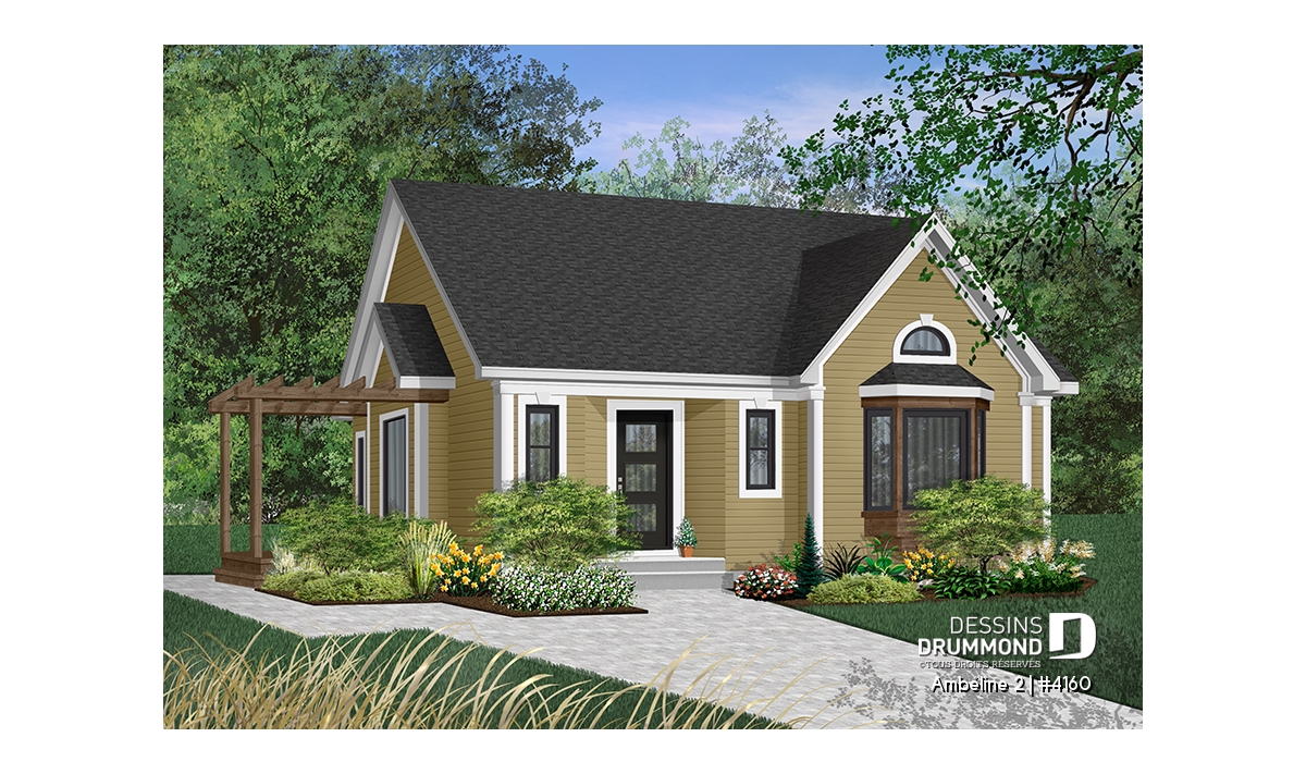 Plan de plain-pied économique de 2 chambres avec s-s aménageable et joli patio avec pergola