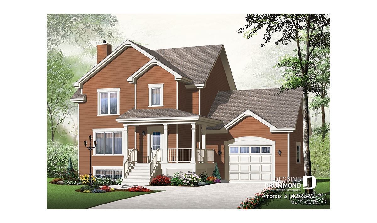 D’abord conçu sous le numéro de plan 2783 proposant 1533pi2 aménagés, ce dernier s’est vu ajouter un premier plan version, le 2783-V1, suggérant les mêmes attributs que le 2783 d’origine mais avec plus de 125pi2 répartis dans chacune des pièces et par le biais d’un élargissement de la maison de 26’ à 28’. Voici maintenant ce 2783-V2 avec 190pi2 de plus que le 2783; pi2 additionnels à nouveau répartis sur l’ensemble des pièces mais avec, cette fois-ci, un remarquable garage de 19’ x 24’.
