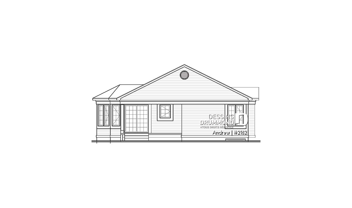 Galerie arrière, fenestration abondante, perron avant abrité.