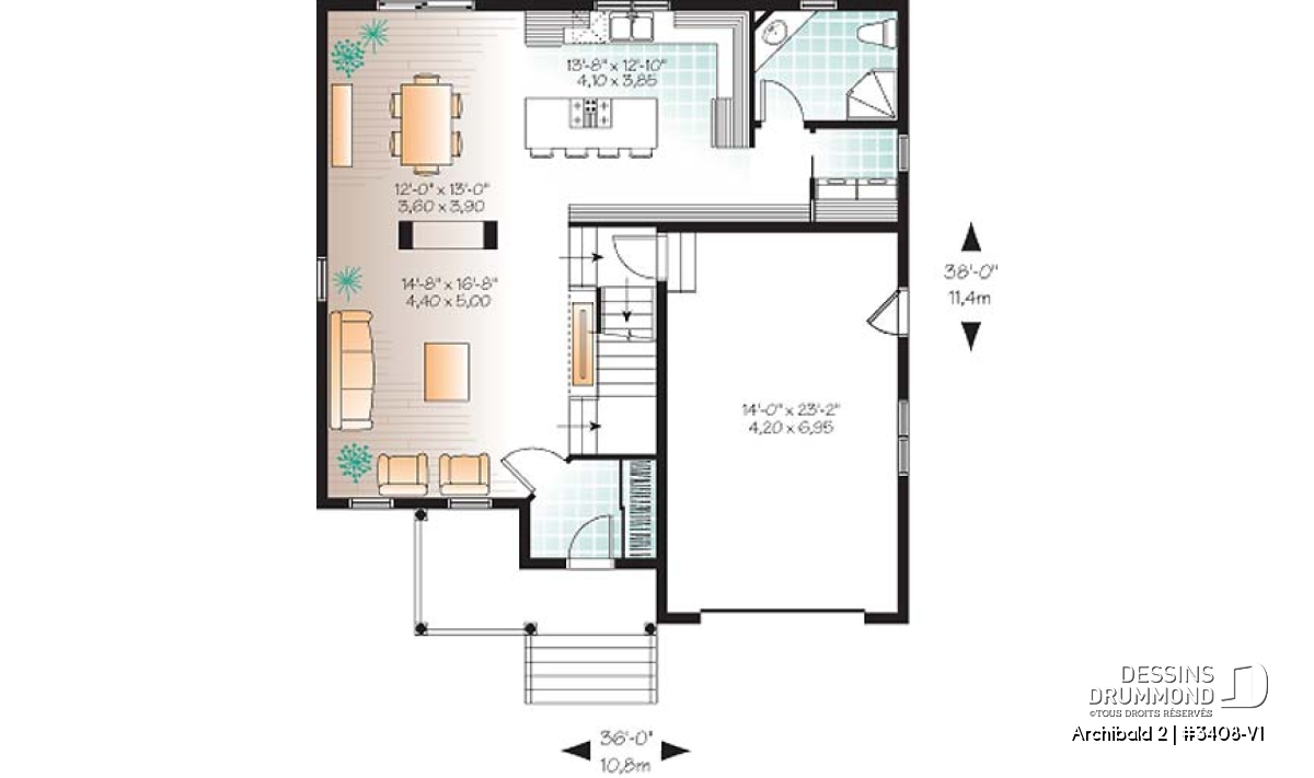 Réalisé à partir du très populaire plan 3408, ce modèle version propose un agrandissement global de 270 pi2 répartis ainsi : 167 pi2 de plus pour la partie habitable, 66 pi2 de plus pour le garage et 36 pi2 de plus pour l’espace boni. Cela permet l’obtention de pièces intérieures de plus grandes dimensions, d’un garage de 14 pi. de largeur intérieure et comme tant demandé de la part des nouveaux propriétaires.