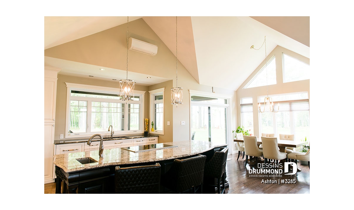 La cuisine offre un grand îlot pouvant accueillir de 4 à 5 personnes, et est adjacente à la buanderie. La salle à dîner peut recevoir une grande table pouvant accueillir 8 à 10 convives, facilement.