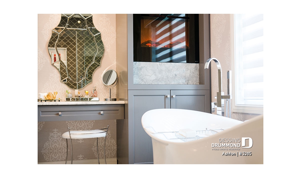 Salle de bain des maîtres avec toilette en cabine, vanité double, comptoir maquillage, bain sur pied et grande douche.