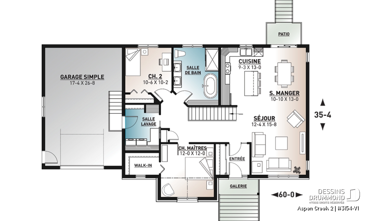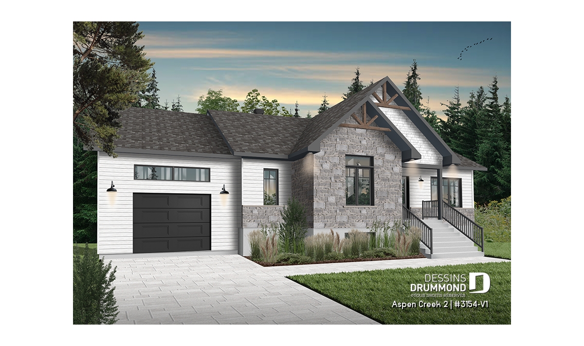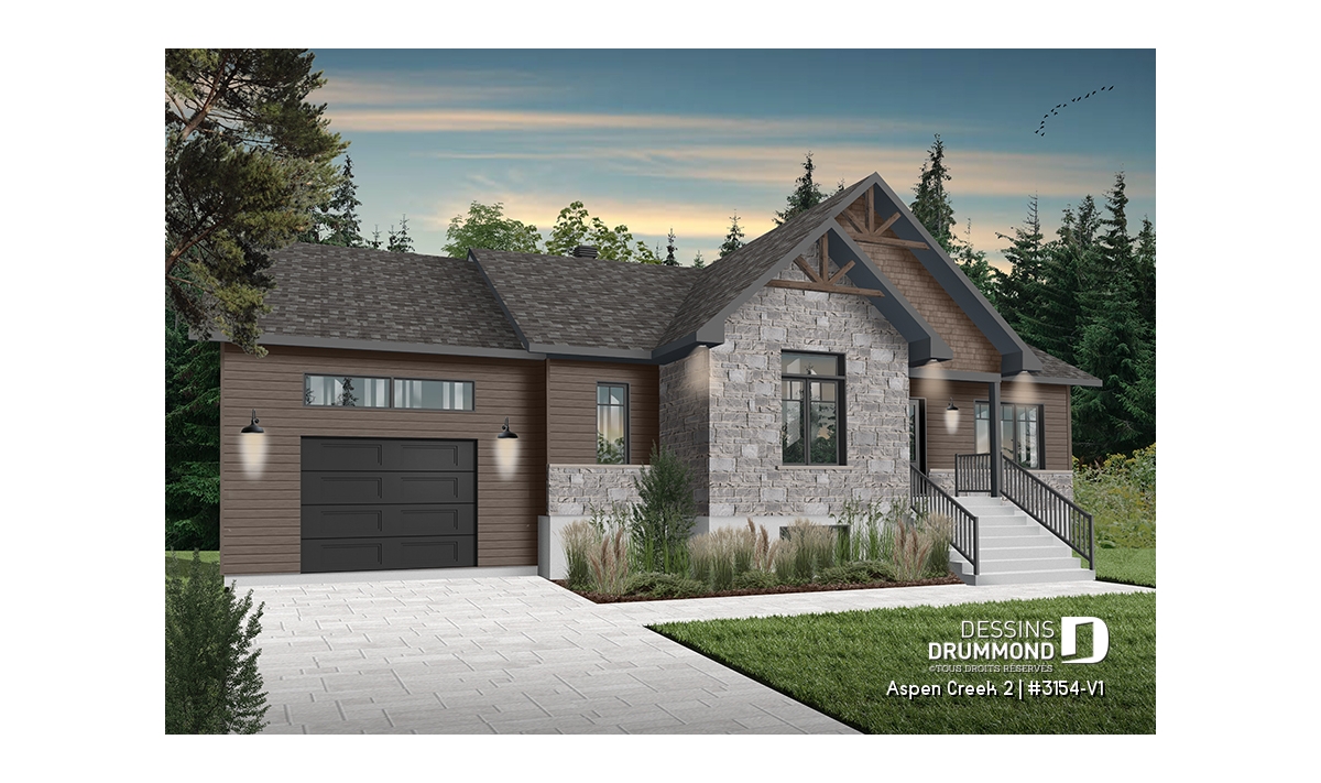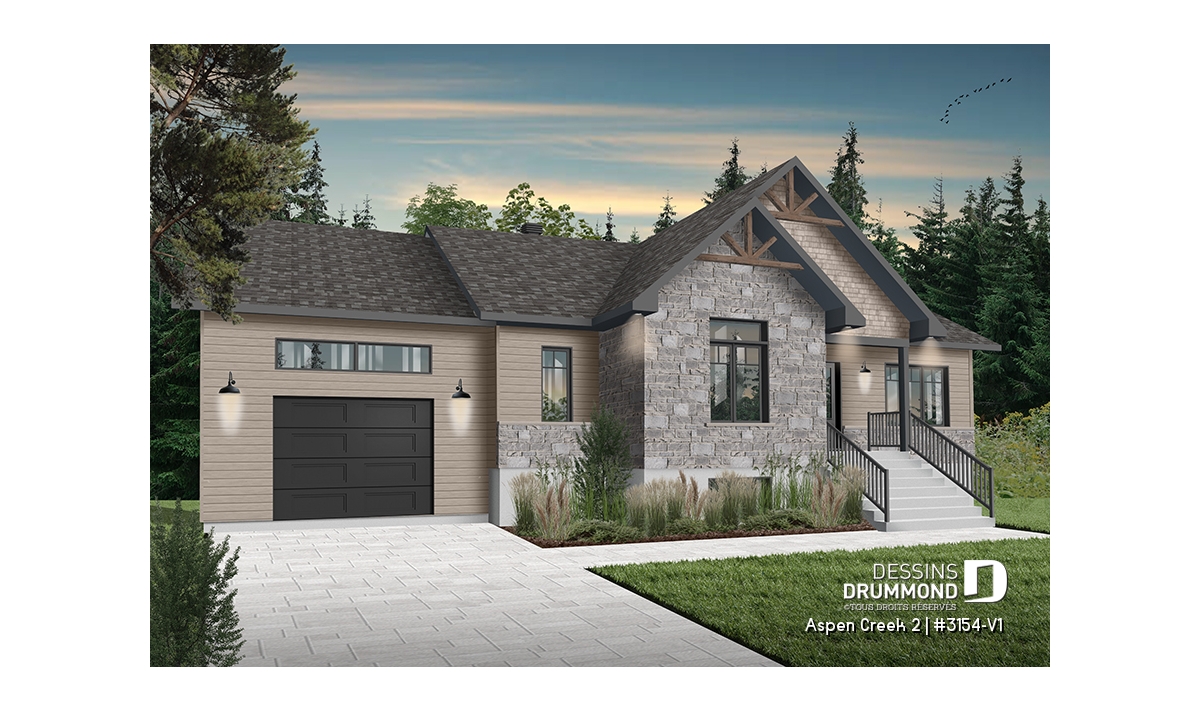 Le plan de maison plain-pied, 2 chambres et garage, de style champêtre suivant, Aspen Creek 2 (3154-V1), nous propose un espace habitable de 1 344 pieds carrés, dans lesquels plusieurs étapes de vie peuvent s’y adapter.