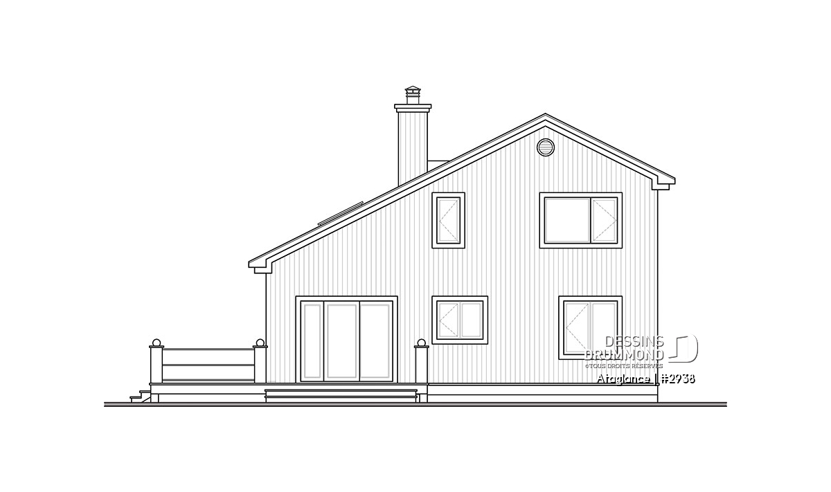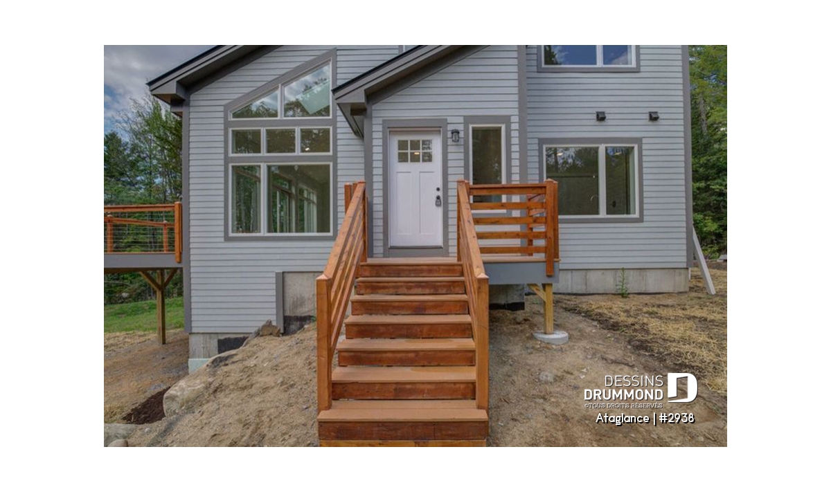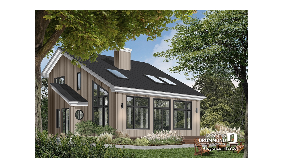 Version couleur no. 1 - Vue avant - Plan de chalet 3 chambres, très fenestré, foyer, mezzanine, plafond cathédrale, tout en lumière - Ataglance