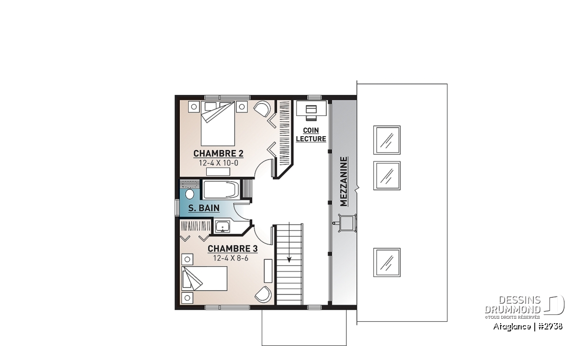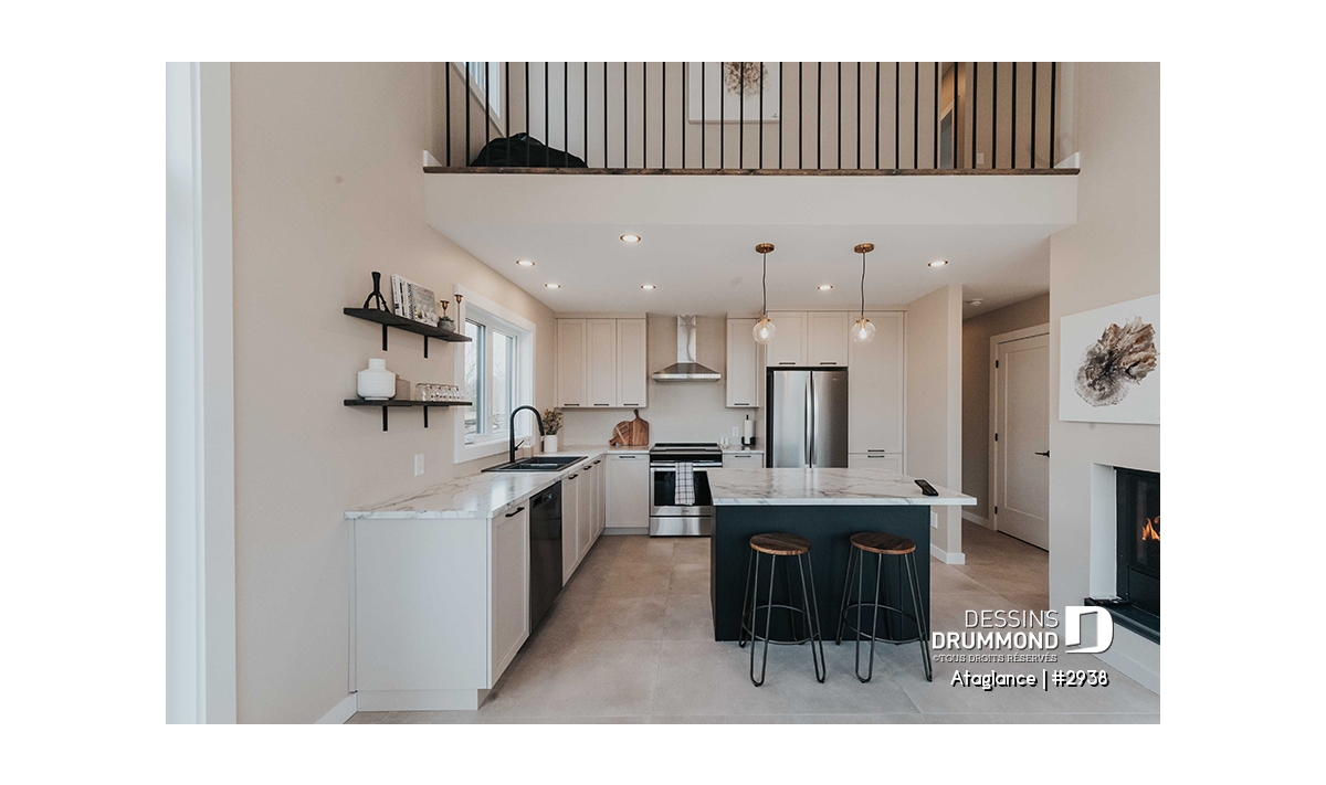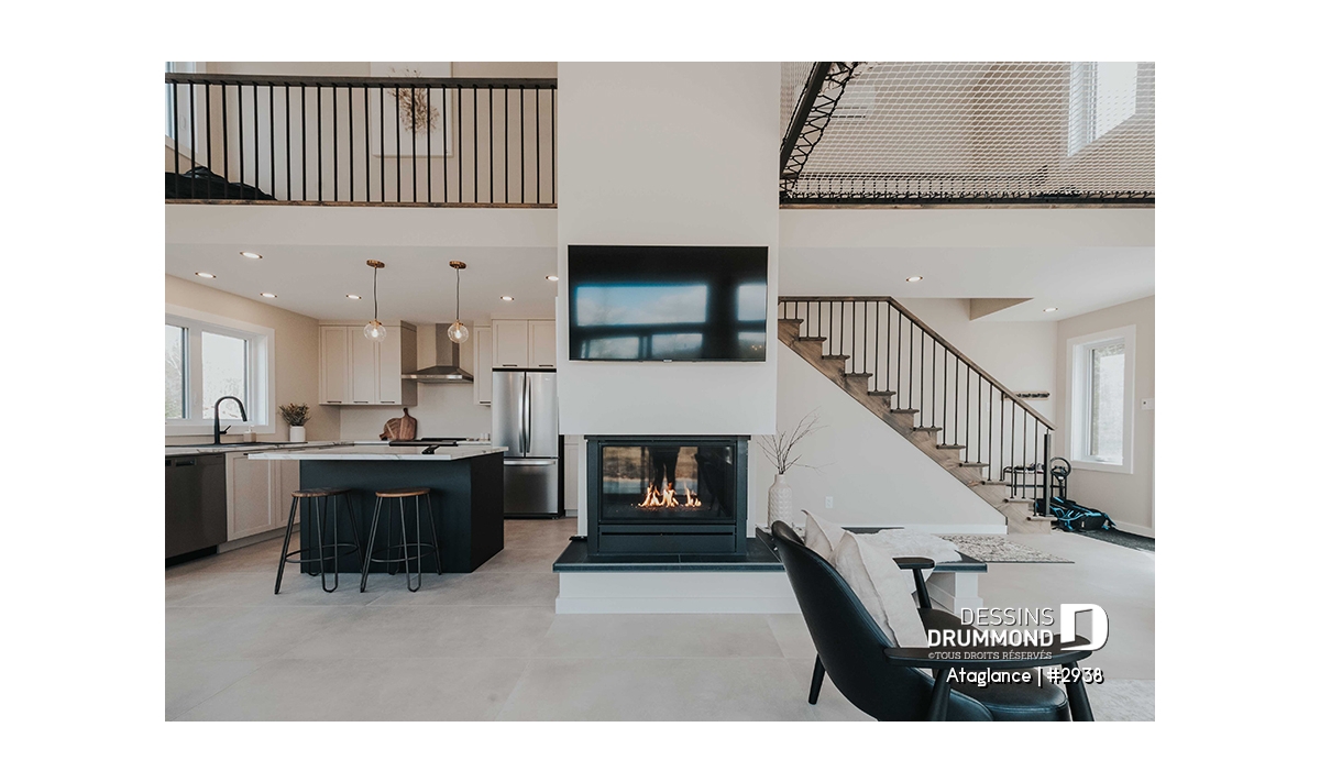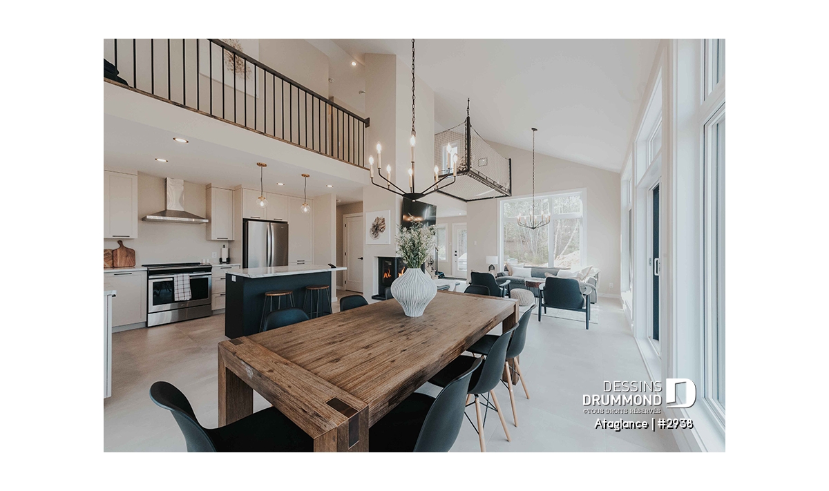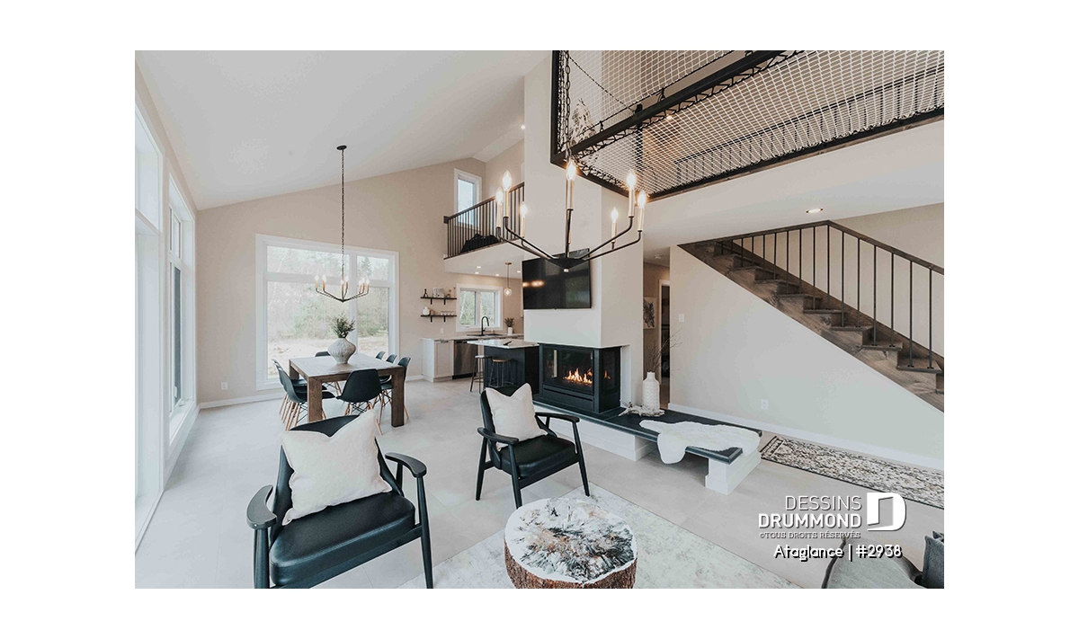 Étage - Plan de chalet 3 chambres, très fenestré, foyer, mezzanine, plafond cathédrale, tout en lumière - Ataglance