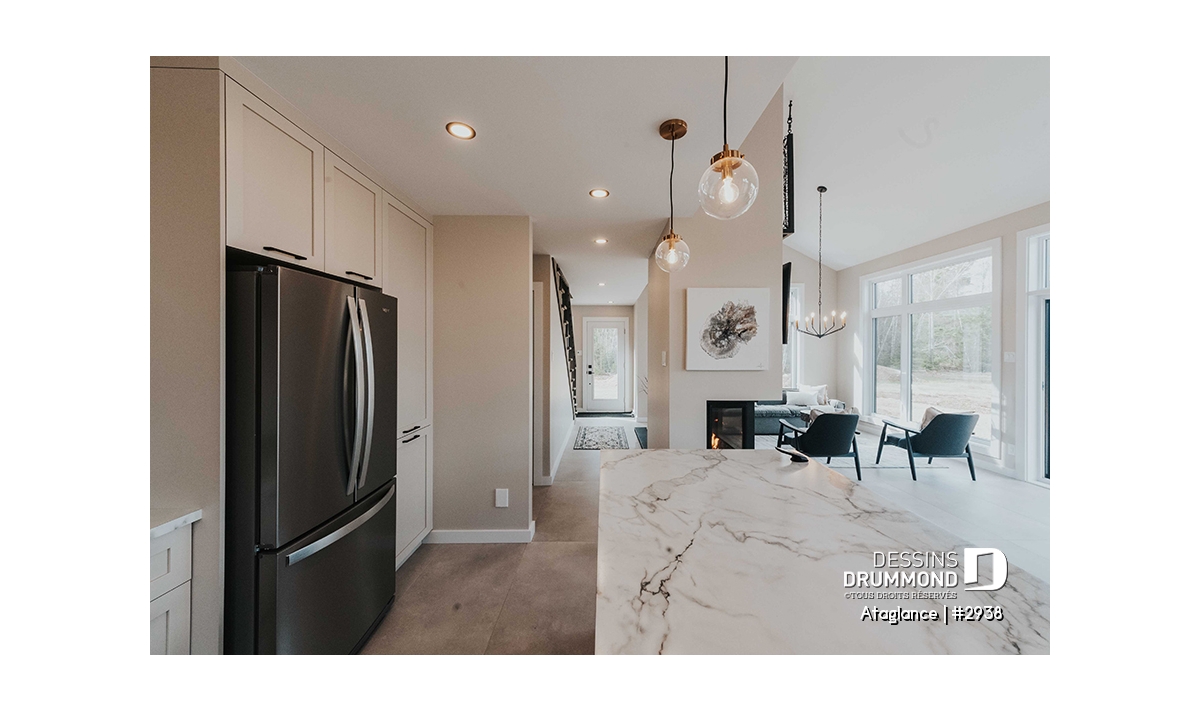Rez-de-chaussée - Plan de chalet 3 chambres, très fenestré, foyer, mezzanine, plafond cathédrale, tout en lumière - Ataglance