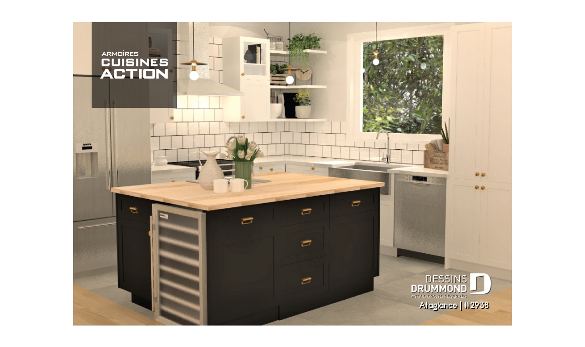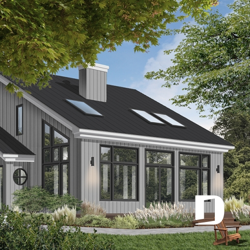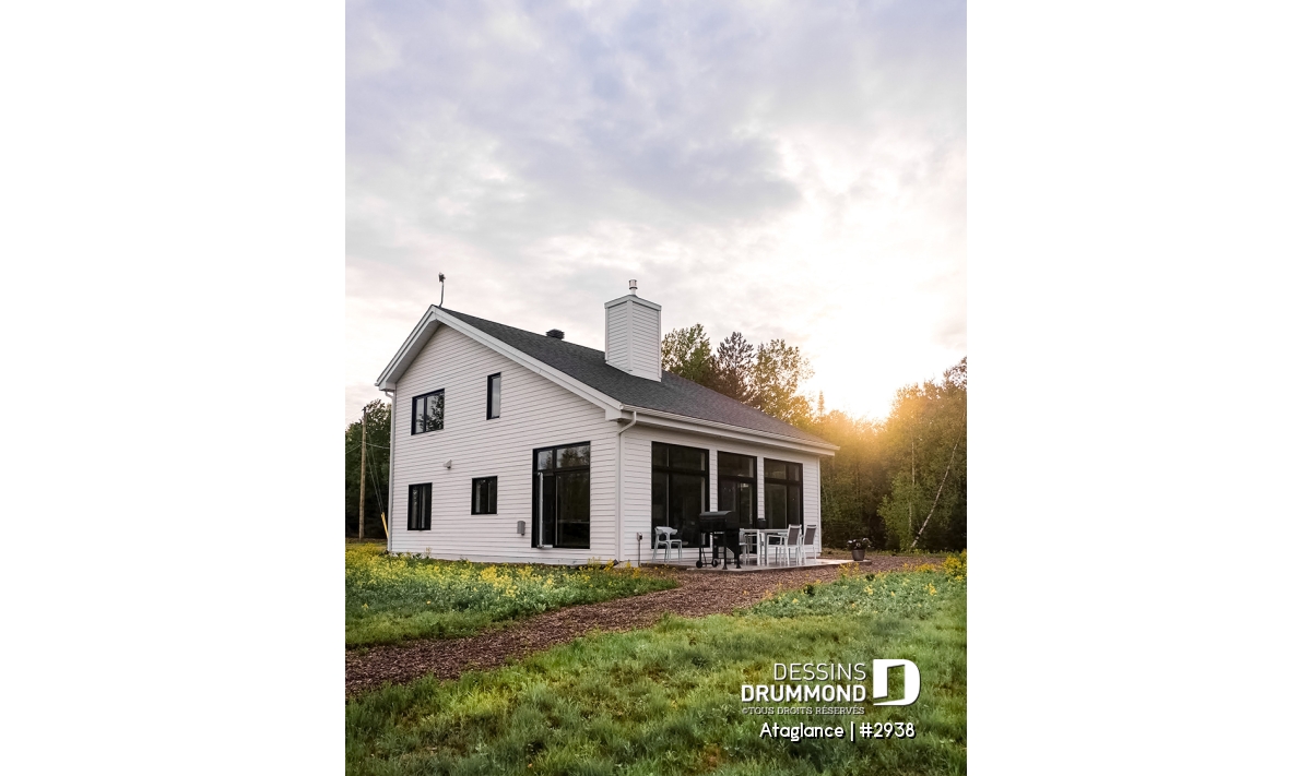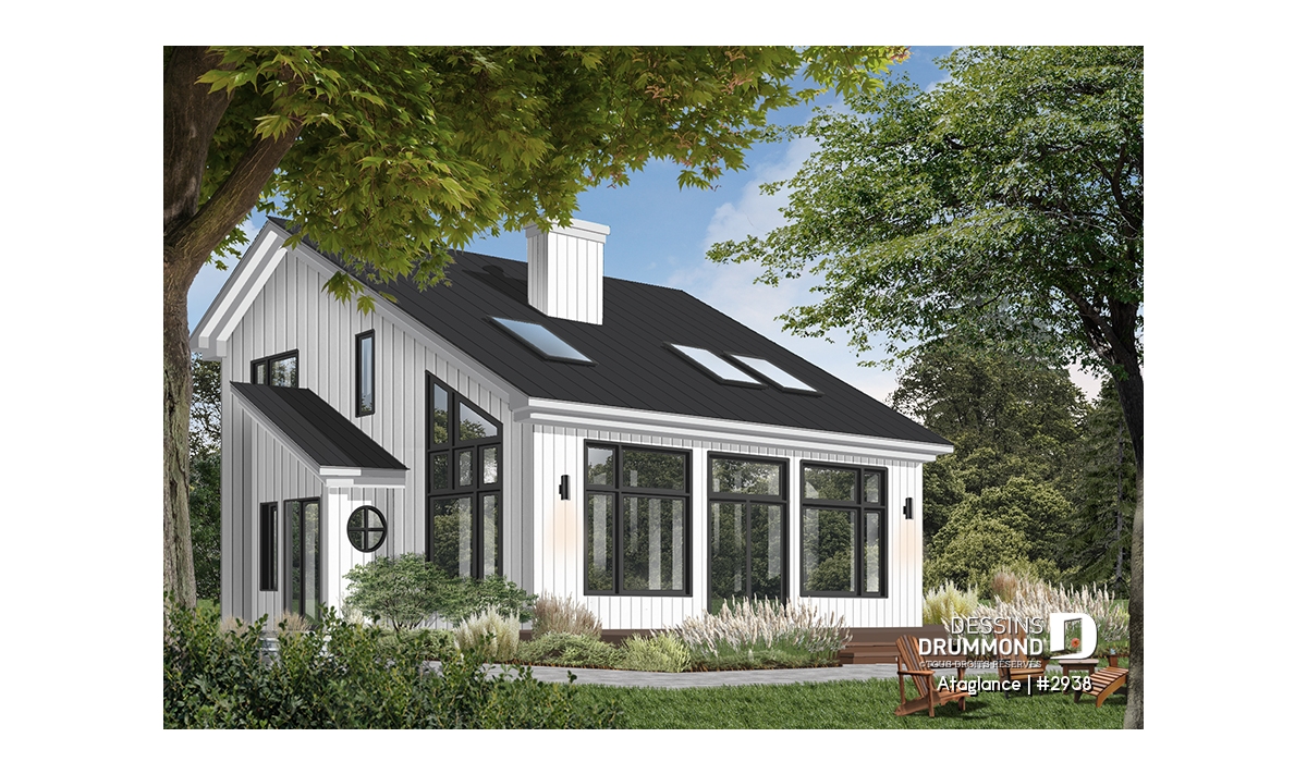 Plan de chalet 3 chambres, très fenestré, foyer, mezzanine, plafond cathédrale, tout en lumière