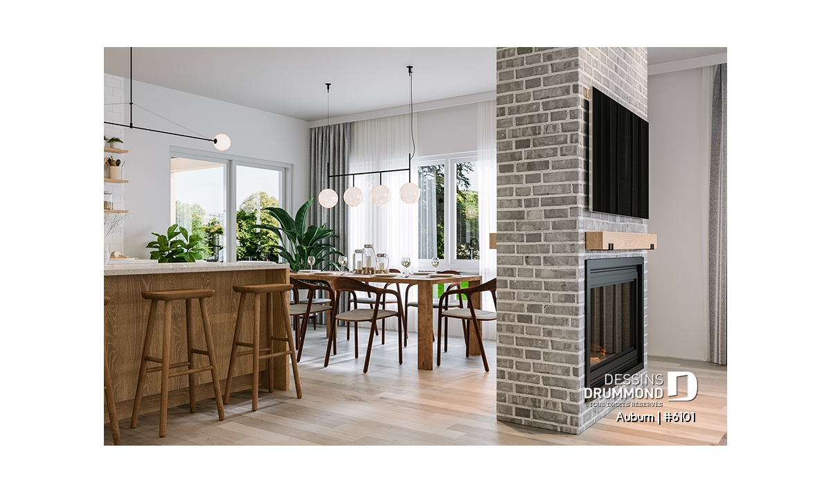 Un des éléments principaux de cette maison est sans aucun doute le foyer central double face qui sépare la salle de séjour, de la salle à manger. Cette dernière donne accès au deuxième élément principal du rez-de-chaussée, la terrasse couverte munie d’un toit cathédral. L’effet de continuité est très intéressant, surtout par de belles soirées d’été.