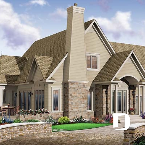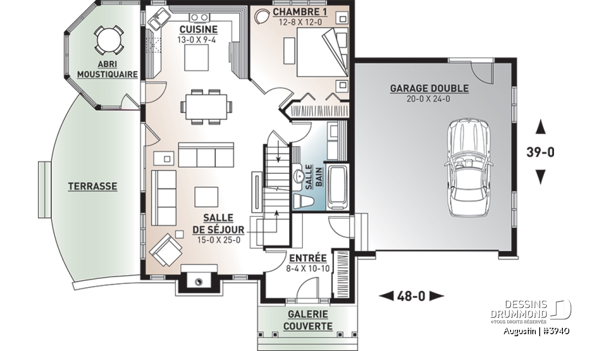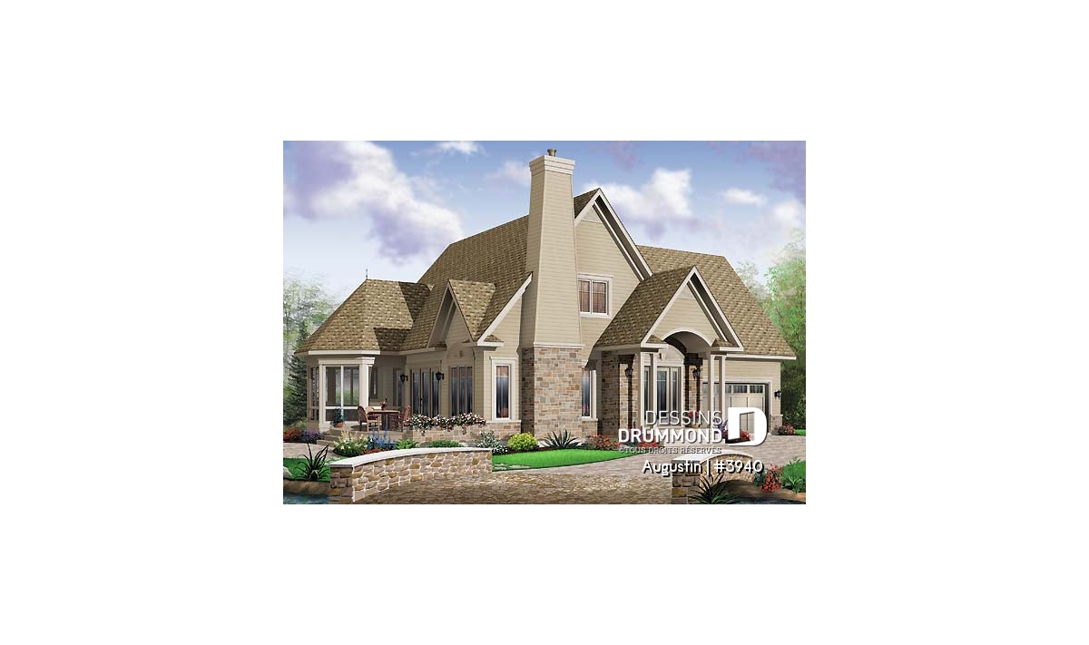 Bel abri-moustiquaire communiquant avec la cuisine. Plafond à 8'-6" au rez-de-chaussée. Fenestration abondante pour panorama latéral gauche. Chambre prévue au rez-de-chaussée. Deux autres fort belles chambres à l'étage et grand espace boni au-dessus du garage double.
