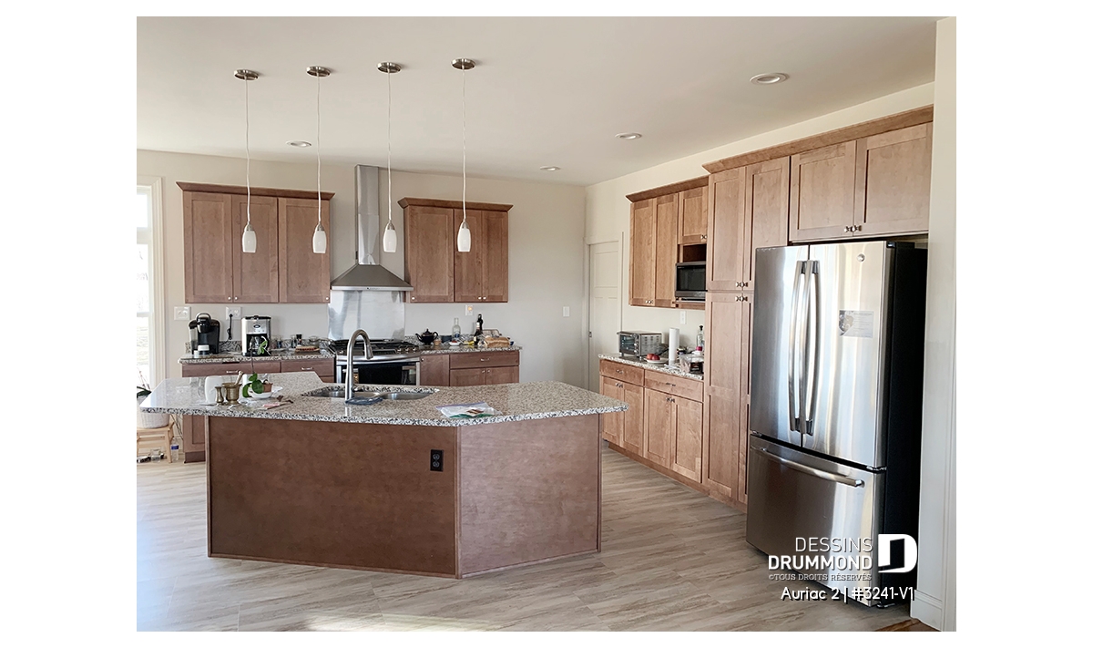 Cuisine fort logeable avec îlot-lunch central bien orienté.
