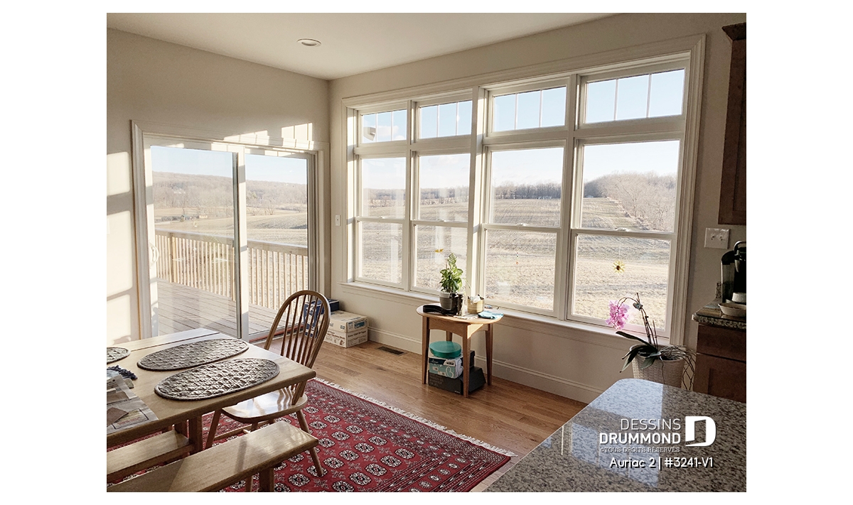 Salle à manger avec fenestration abondante dont une porte-patio donnant sur la terrasse latérale-arrière.