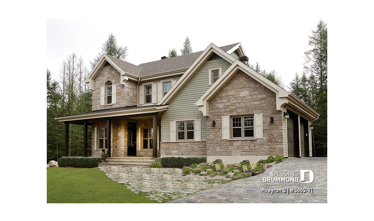 Vue avant - MODÈLE DE BASE - Plan de maison de campagne à étage, 3 chambres, 2.5 salles de bain, garage double - Aveyron 2