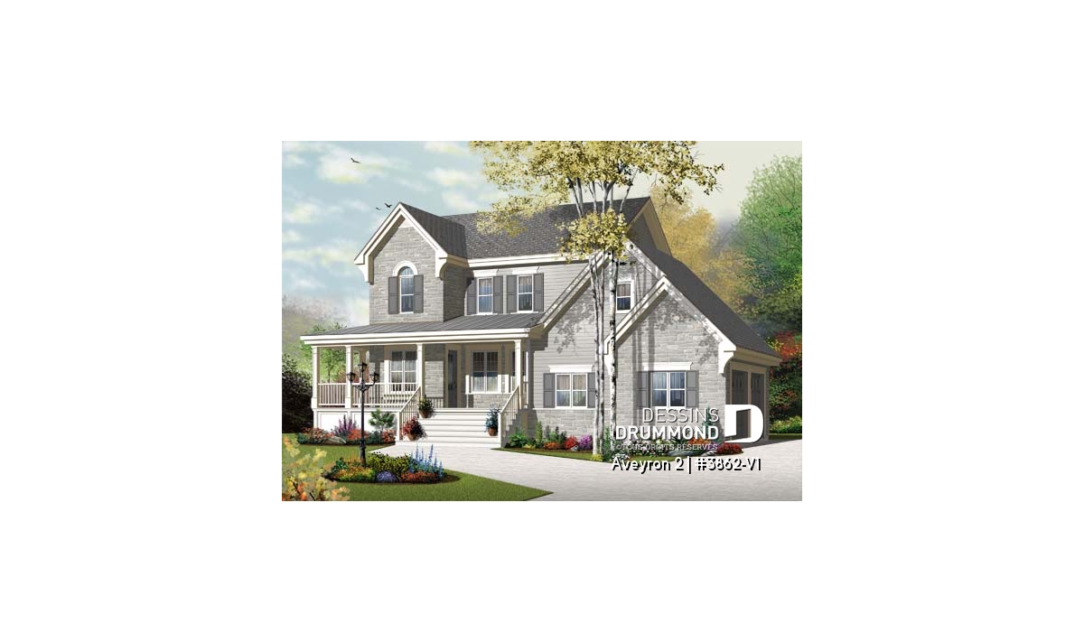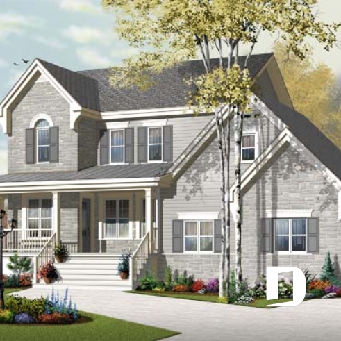 Plan de maison de campagne à étage, 3 chambres, 2.5 salles de bain, garage double