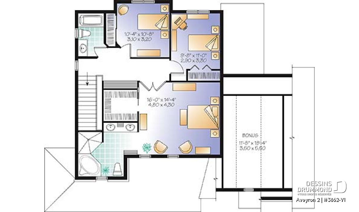 Étage - Plan de maison de campagne à étage, 3 chambres, 2.5 salles de bain, garage double - Aveyron 2