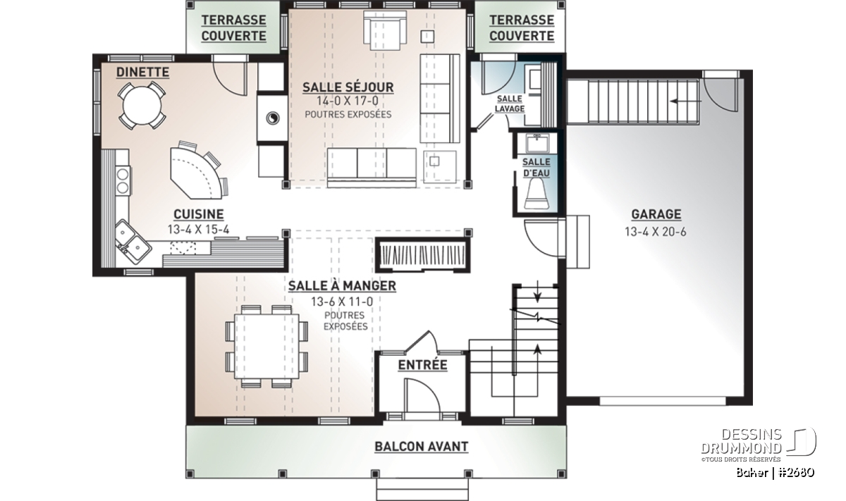 Fait à noter sur ce modèle: comme il fut conçu dans un réel esprit champêtre, il offre donc la possibilité d’aménager esthétiquement, au plafond de tout le rez-de-chaussée, de fausses ou de véritables poutres espacées d’environ 40 po. ( 1 mètre ) rappelant la façon de faire de nos ancêtres et créant un effet à nul autre pareil lorsqu’il s’agit de se rapprocher du phénomène champêtre.
