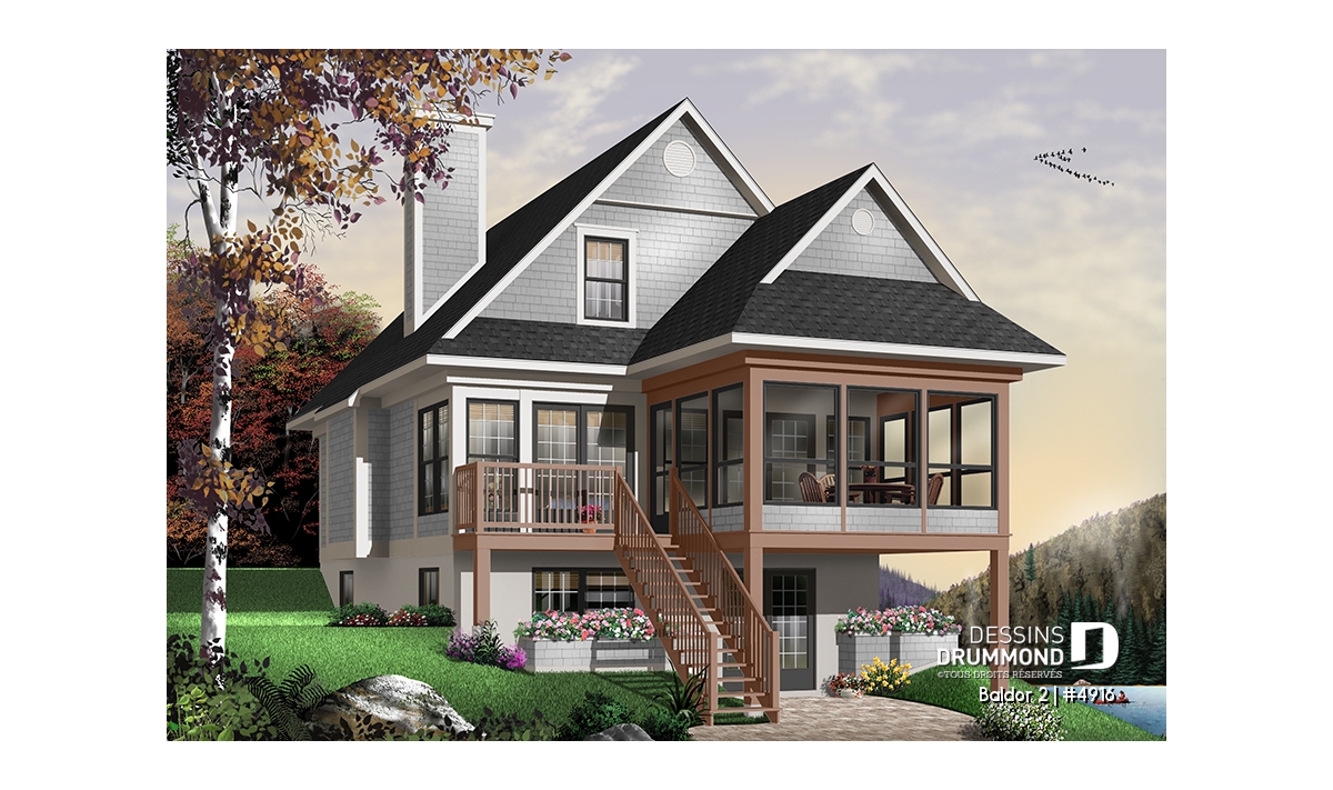 Plan de chalet ou maison avec vue panoramique, 3 chambres, foyer, abri moustiquaire, parents au premier