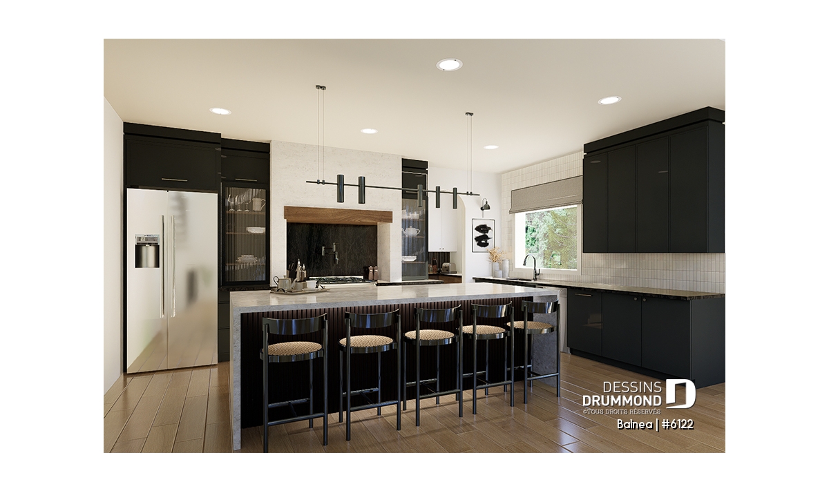 Cuisine moderne avec îlot de grand format incluant un espace pour cellier intégré.