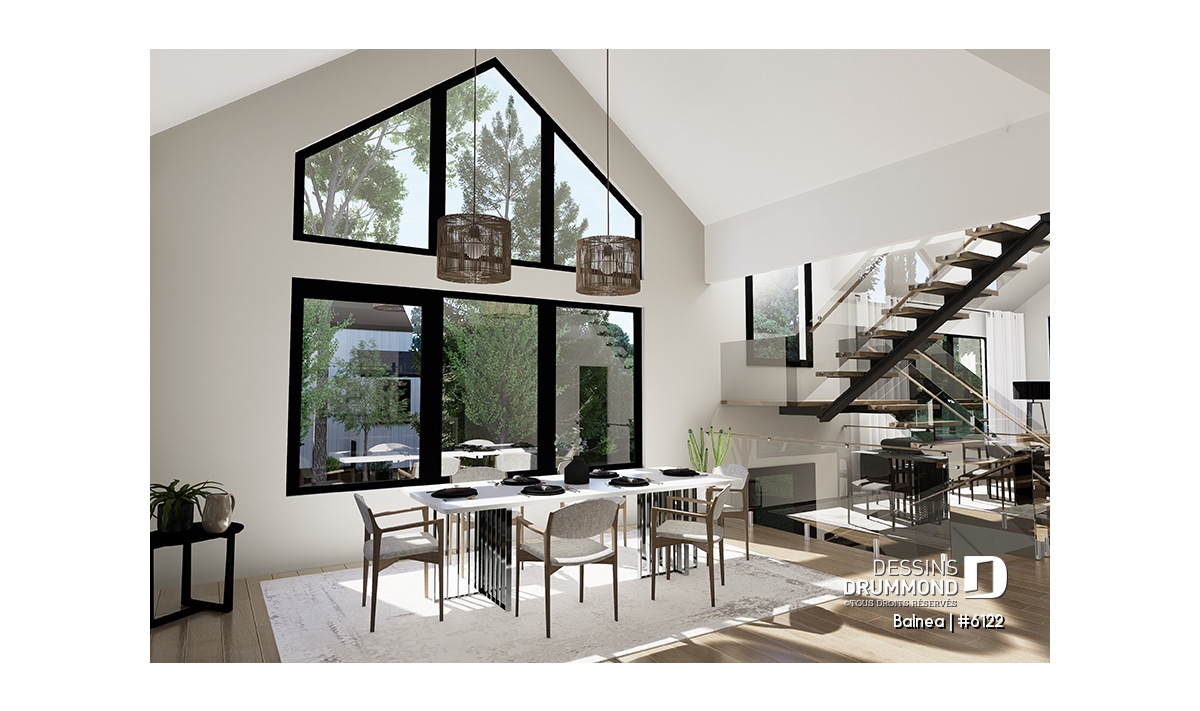 Plafond cathédrale de 18' à la salle à manger et à la salle de séjour.