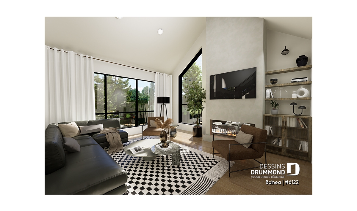 Grand salon avec plafond cathédrale de 16' et superbe foyer central.