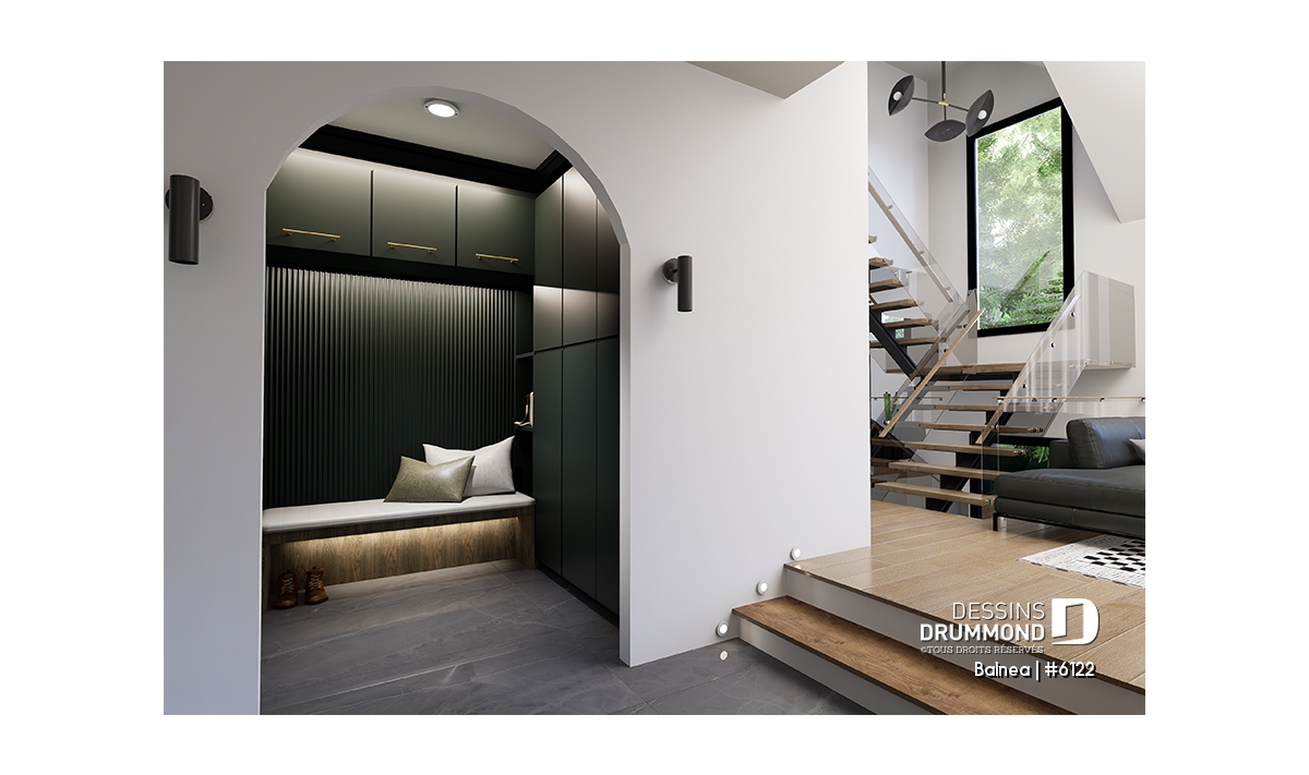 Cette maison d’inspiration scandinave avec pierre en façade (partielle) combine chaleur, authenticité et design moderne. Son extérieur noble et intemporel s’harmonise parfaitement avec son aménagement intérieur lumineux et spacieux. Dès l’entrée, vous êtes accueilli par une grande entrée avant au plafond de 10'4", créant une impression de grandeur et de convivialité. L’entrée avant et du garage mènent directement à un vaste vestiaire avec banquette intégrée, pratique pour déposer manteaux et chaussures au quotidien et garder la maison ordonnée. Une petite salle d’eau, judicieusement placée près du salon, offre confort et commodité à vos invités.