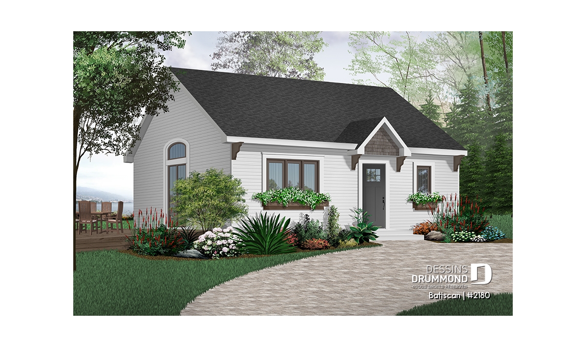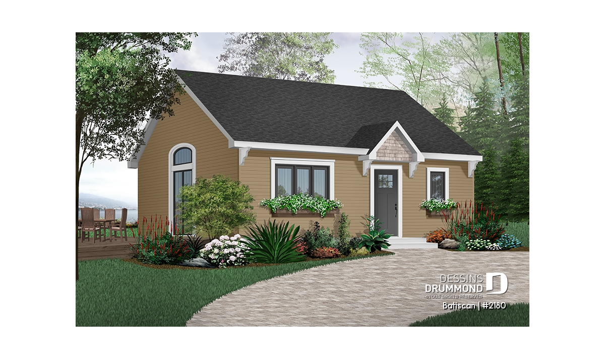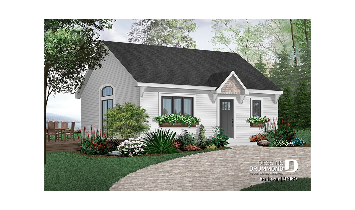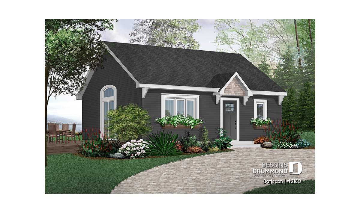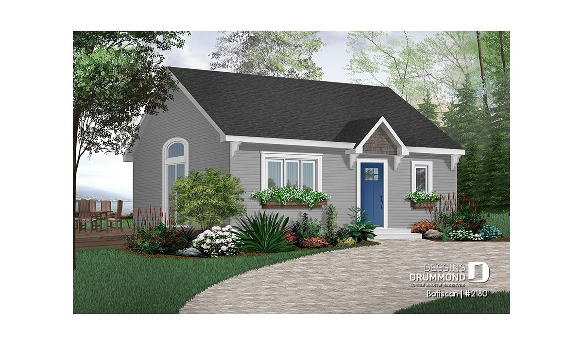 Vue avant - MODÈLE DE BASE - Plan de maison ou chalet petit budget, rangement, espace ouvert, plafond cathédrale, buanderie - Batiscan