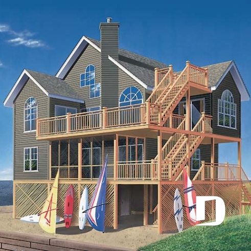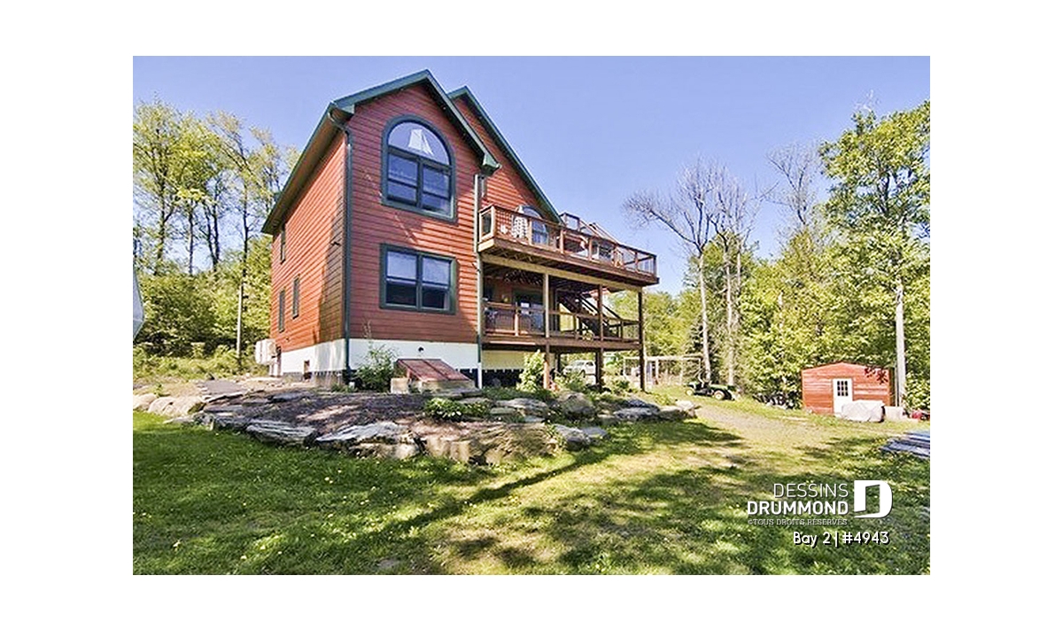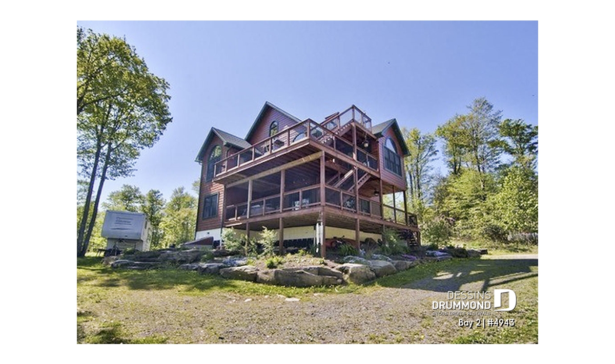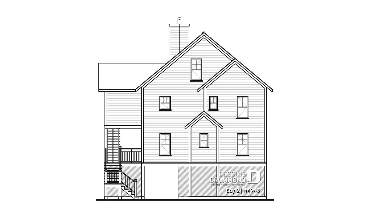 Vue avant - MODÈLE DE BASE - Plan de chalet 3 étages, idéal pour bord de lac, 5 chambres, 3.5 salles de bain, foyer au salon, mezzanine - Bay 2