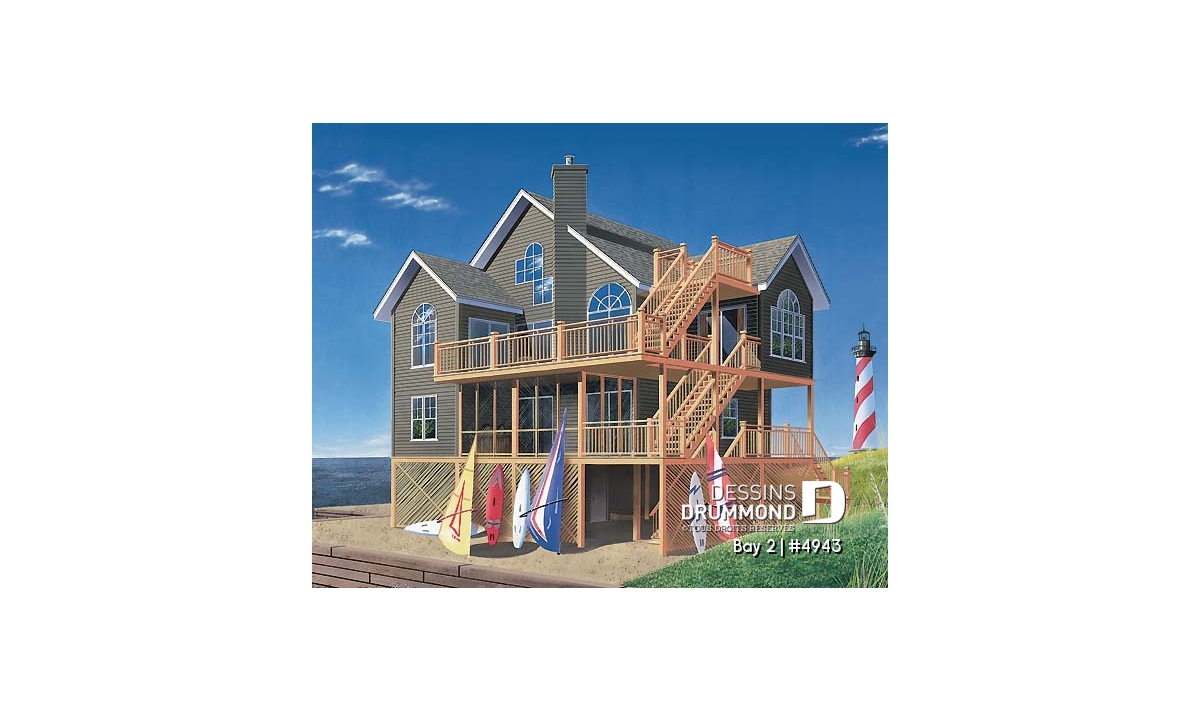 Plan de chalet bord de l'eau avec 5 chambres, 3.5 salles de bain, mezzanine, 2 terrasses