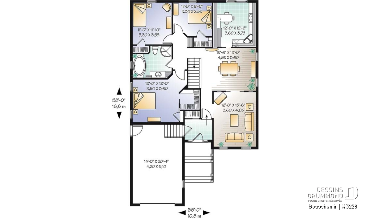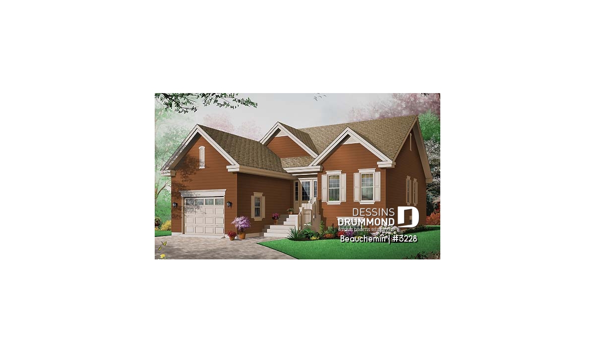 Plain-pied de 3 chambres idéal pour terrain étroit. Espace buanderie envisageable dans la garde-robe de la chambre no.3.