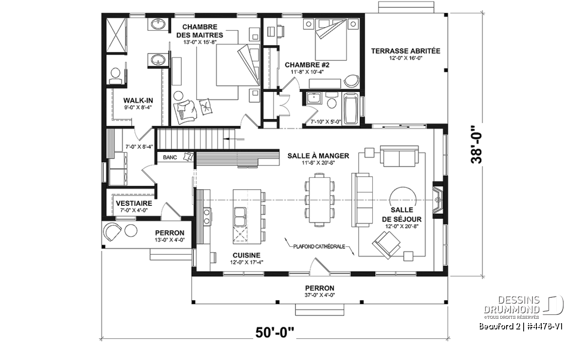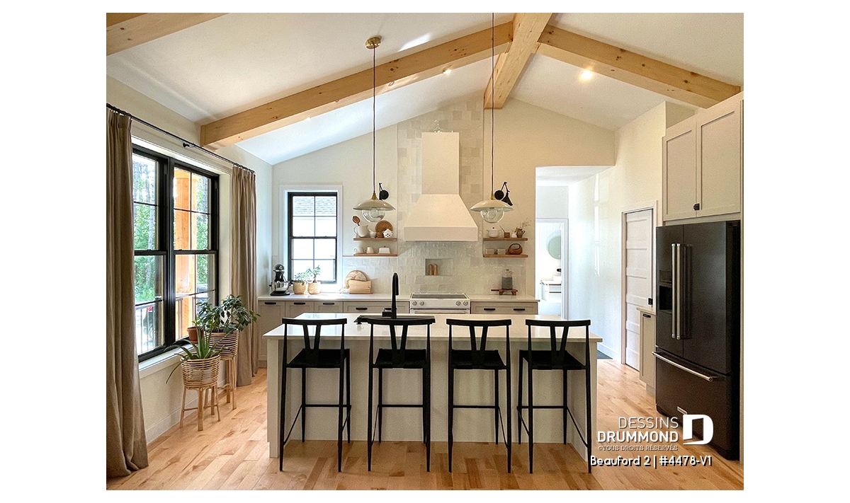 Plafond cathédrale à la cuisine, salle à manger et salon.