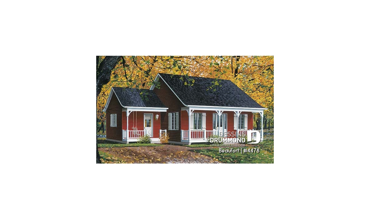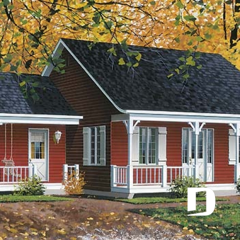 Plain-pied populaire style ranch, plan de maison avec 2 entrées, 2 chambres et galerie arbitrée