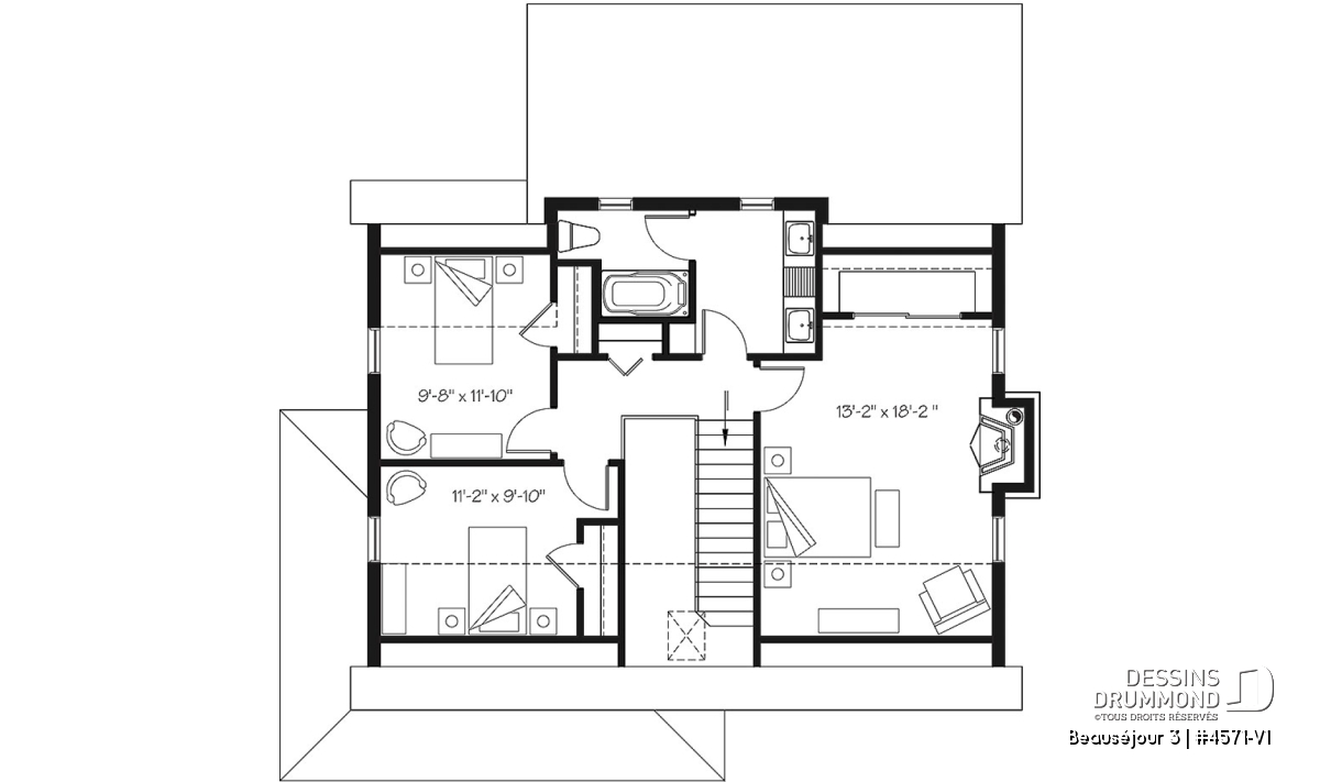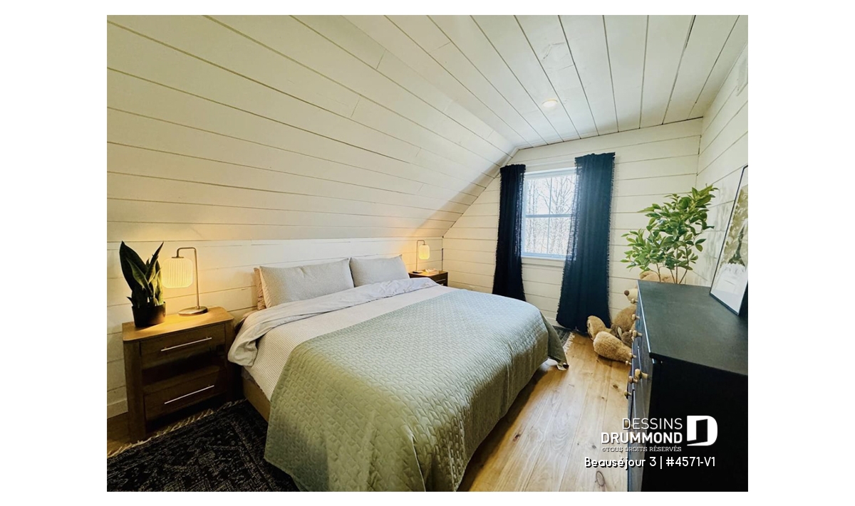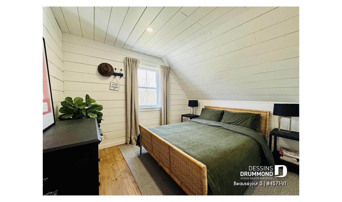 À l’étage et attenante à la salle de bain familiale, la chambre des maîtres est de bon format (13’2’’ x 18’) avec foyer, plafond en pente et grande garde-robe de type walk-in. La salle de bain familiale propose une double vanité et une lingerie attenante. La toilette et le bain douche sont séparés du coin vanité permettant ainsi une meilleure circulation dans cet espace. Deux chambres secondaires avec garde-robe viennent compléter ce magnifique nouveau plan de maison champêtre.