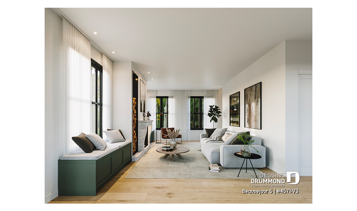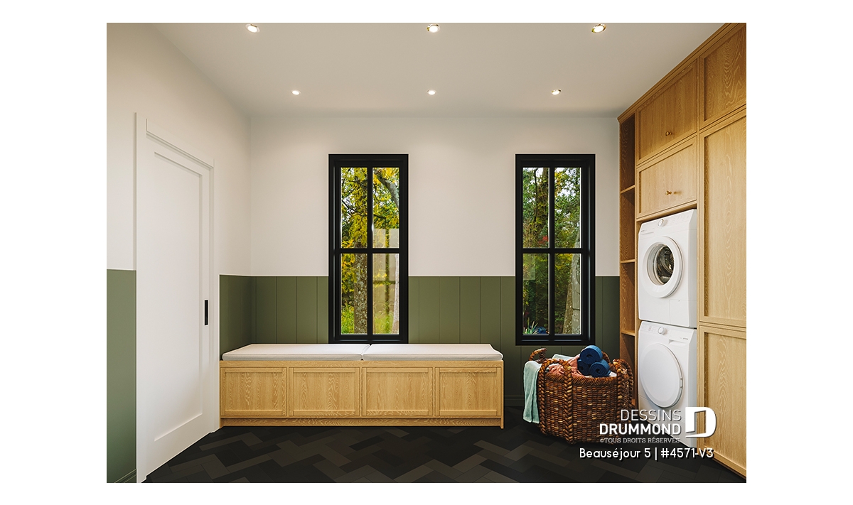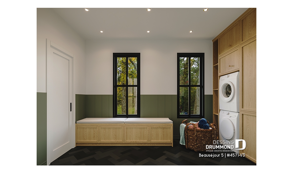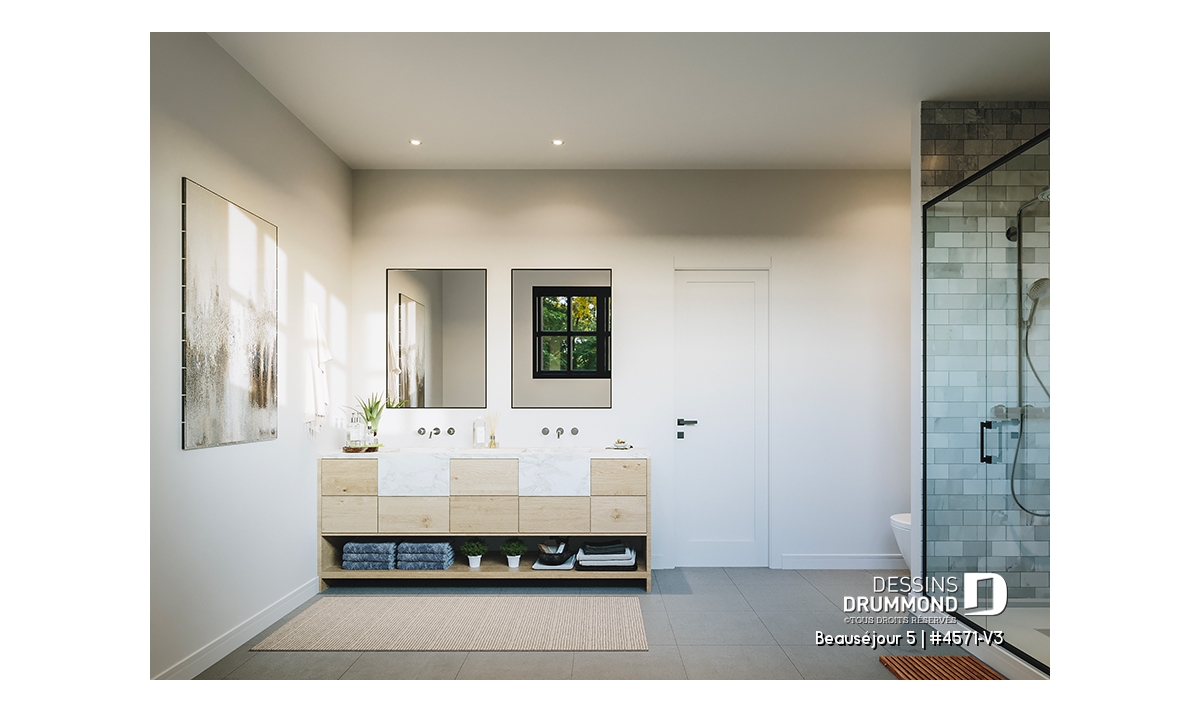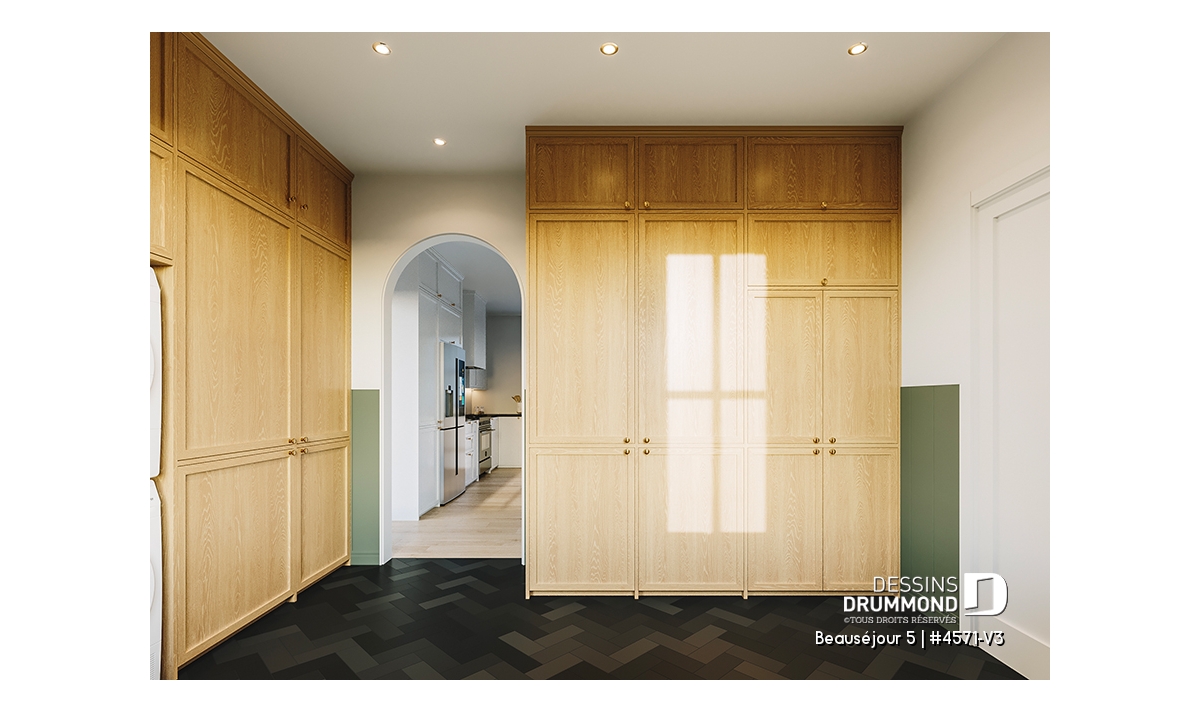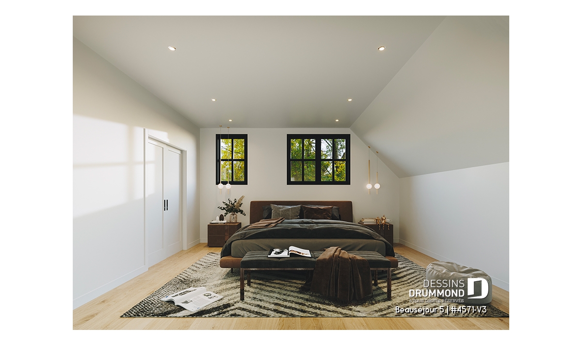 Le plan de maison BEAUSÉJOUR 5 (#4571-V3) propose 2826 pieds carrés aménagés sur 3 planchers, incluant un *sous-sol aménagé optionnel ($). Il est à noter que tous les planchers du rez-de-chaussée sont à 9' de hauteur et qu'il y a des plafonds en pente à la chambre des maîtres et également à la chambre #2.