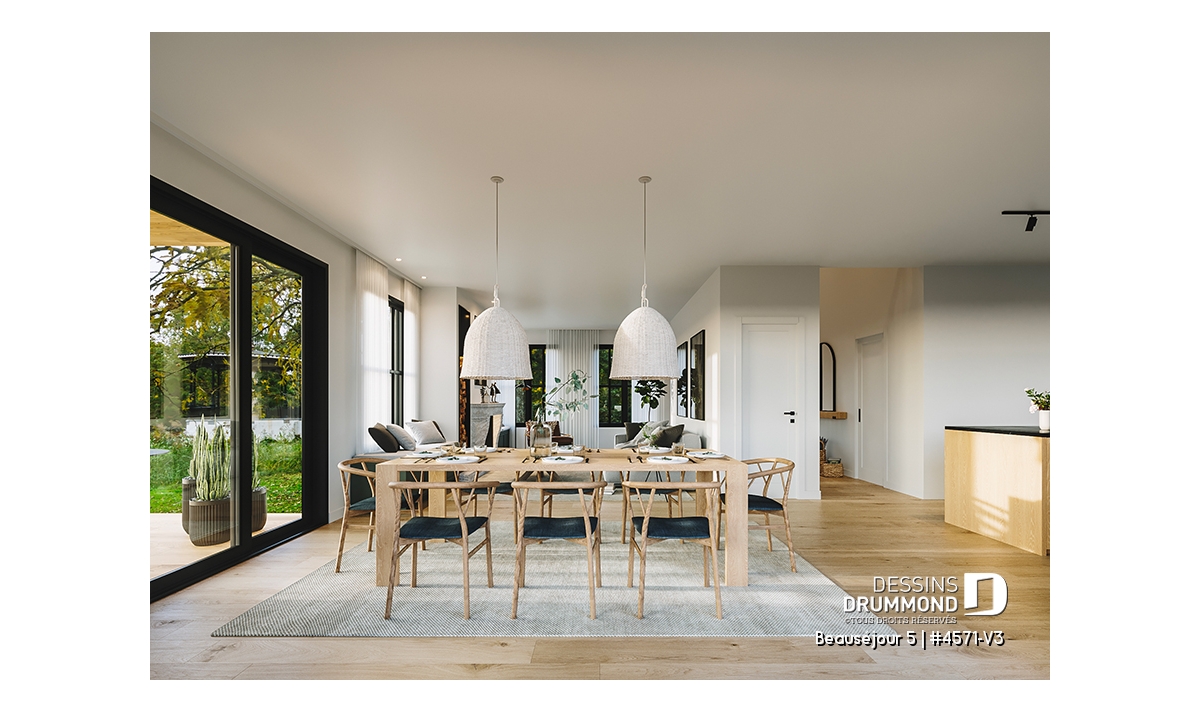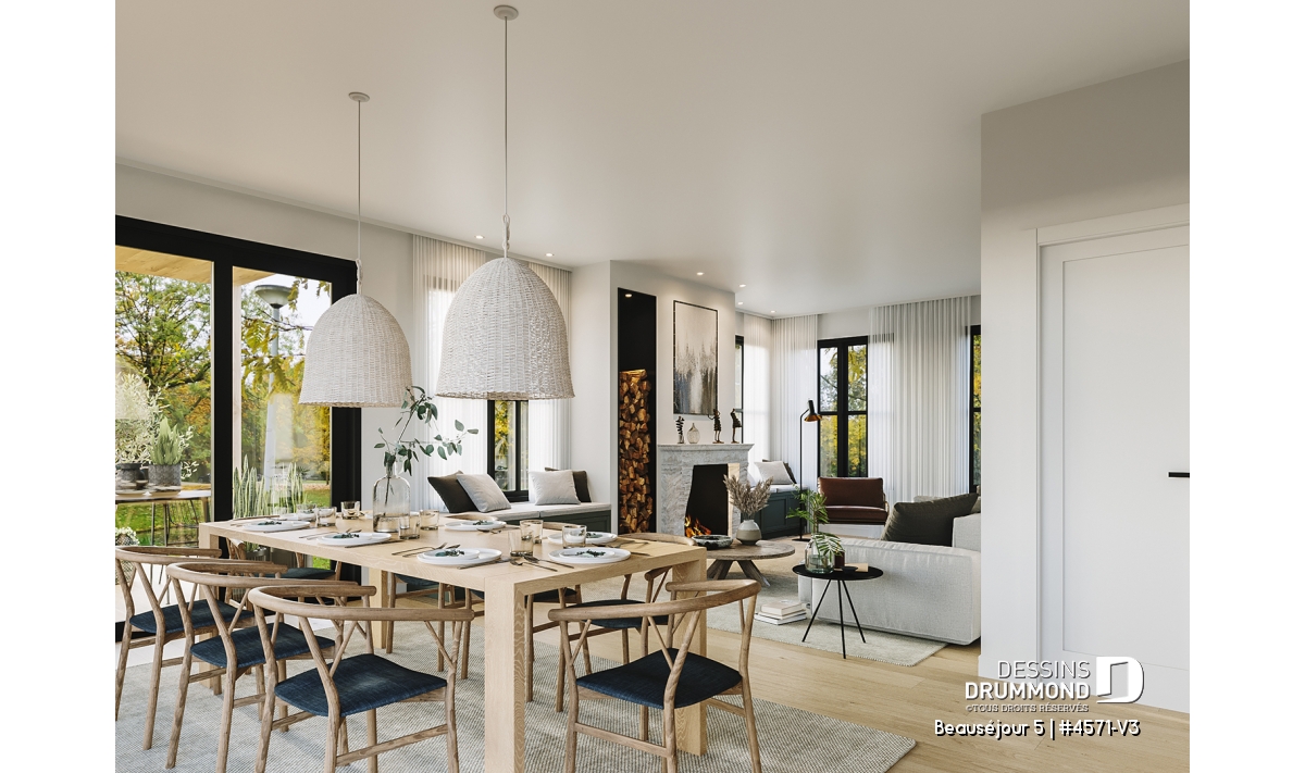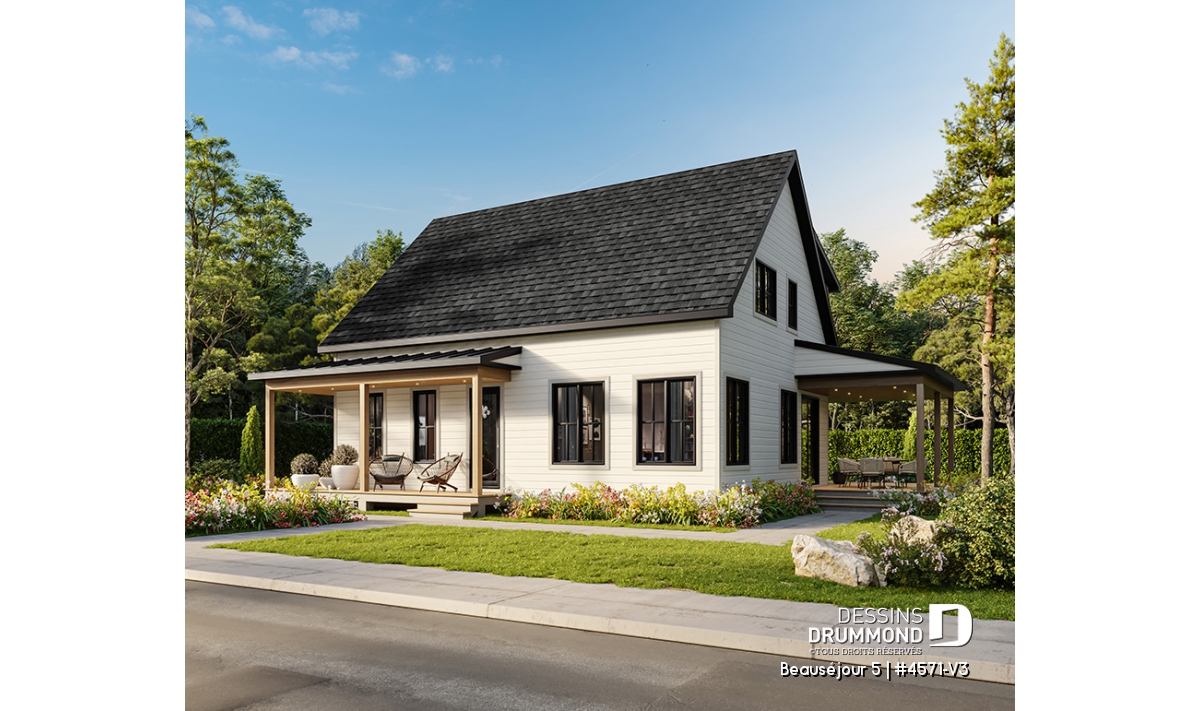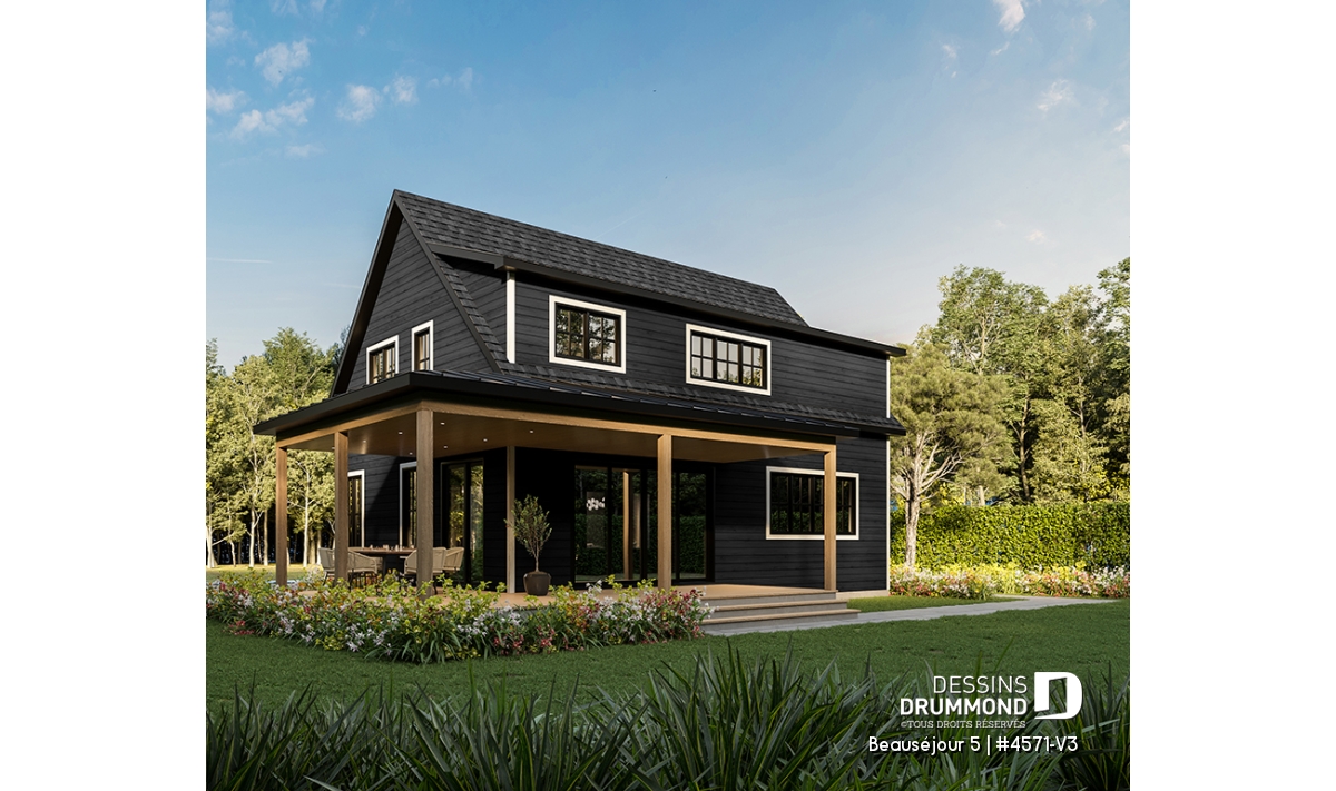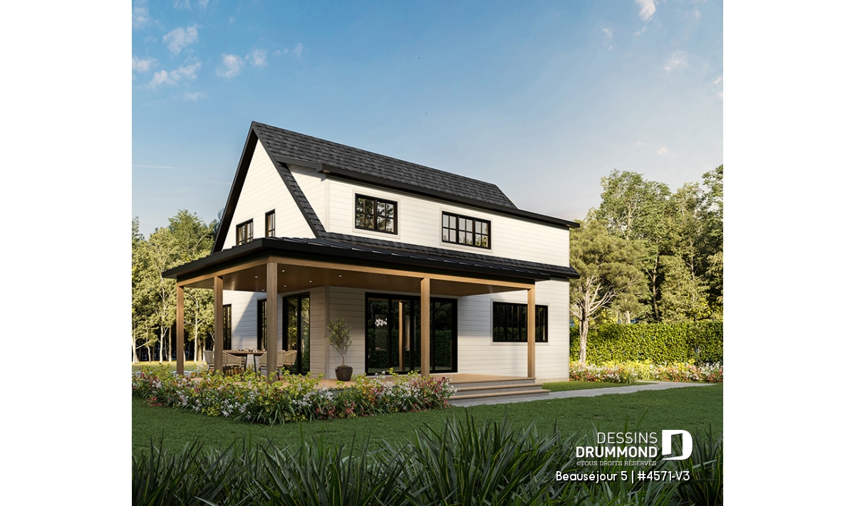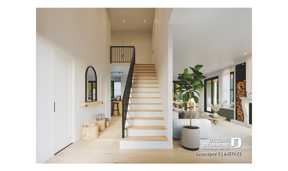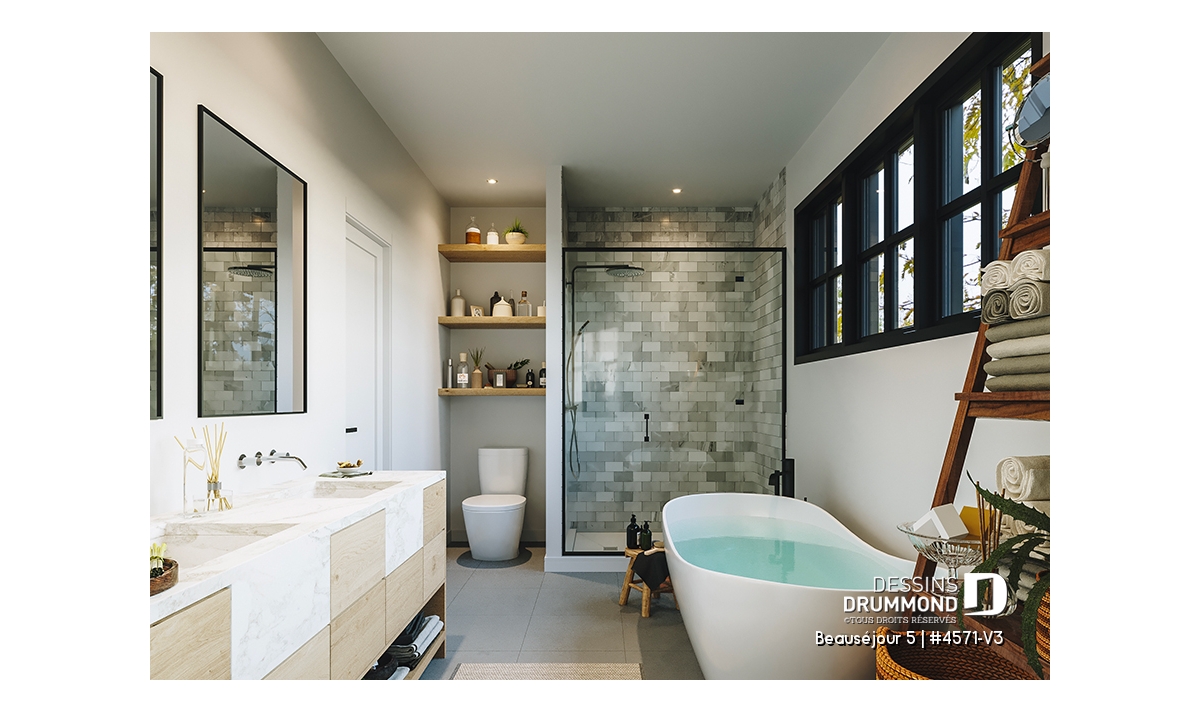 Le plan de maison BEAUSÉJOUR 5 (#4571-V3) propose 2826 pieds carrés aménagés sur 3 planchers, incluant un *sous-sol aménagé optionnel ($). Il est à noter que tous les planchers du rez-de-chaussée sont à 9' de hauteur et qu'il y a des plafonds en pente à la chambre des maîtres et également à la chambre #2.