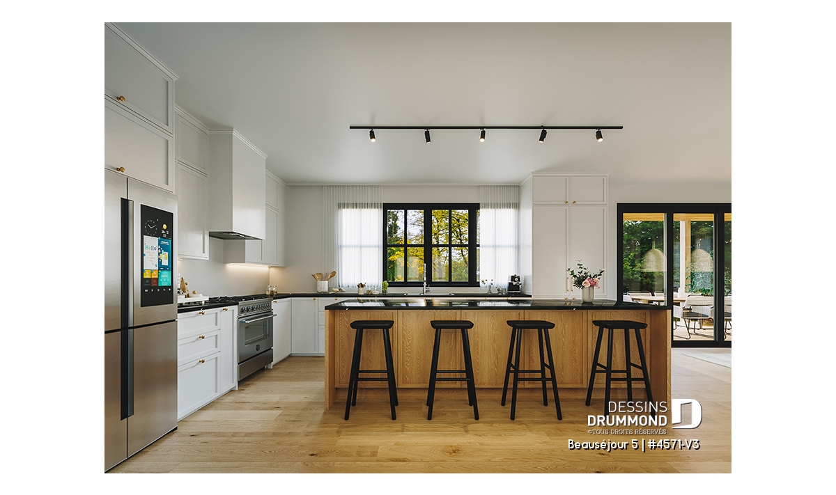 La cuisine est au fond de la maison et possède un très grand îlot, pouvant recevoir aisément 4 à 5 personnes, en plus d'un garde-manger. Ce dernier est près de l'entrée latérale de la maison, pratique pour ranger rapidement les denrées, au retour de l'épicerie! La salle de séjour est ouverte sur la salle à manger, et propose un foyer.