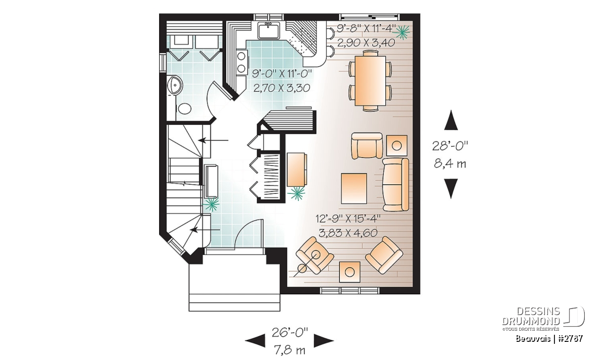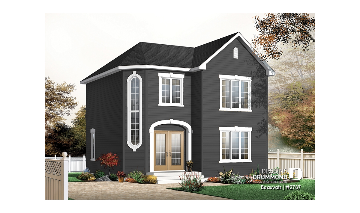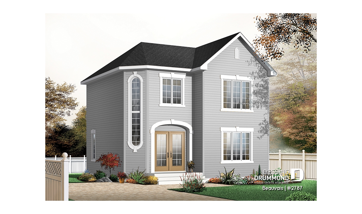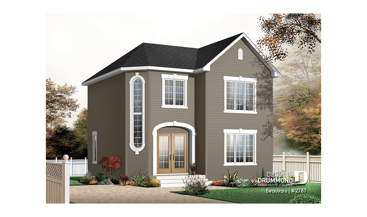 Cachet extérieur distinctif avec cette fenêtre originale permettant aussi un bien bel éclairage dans le secteur entrée principale. Belle salle de séjour et belle chambre des maîtres pour un tel format de maison. Option de deux ou trois chambres; les deux incluses au plan.