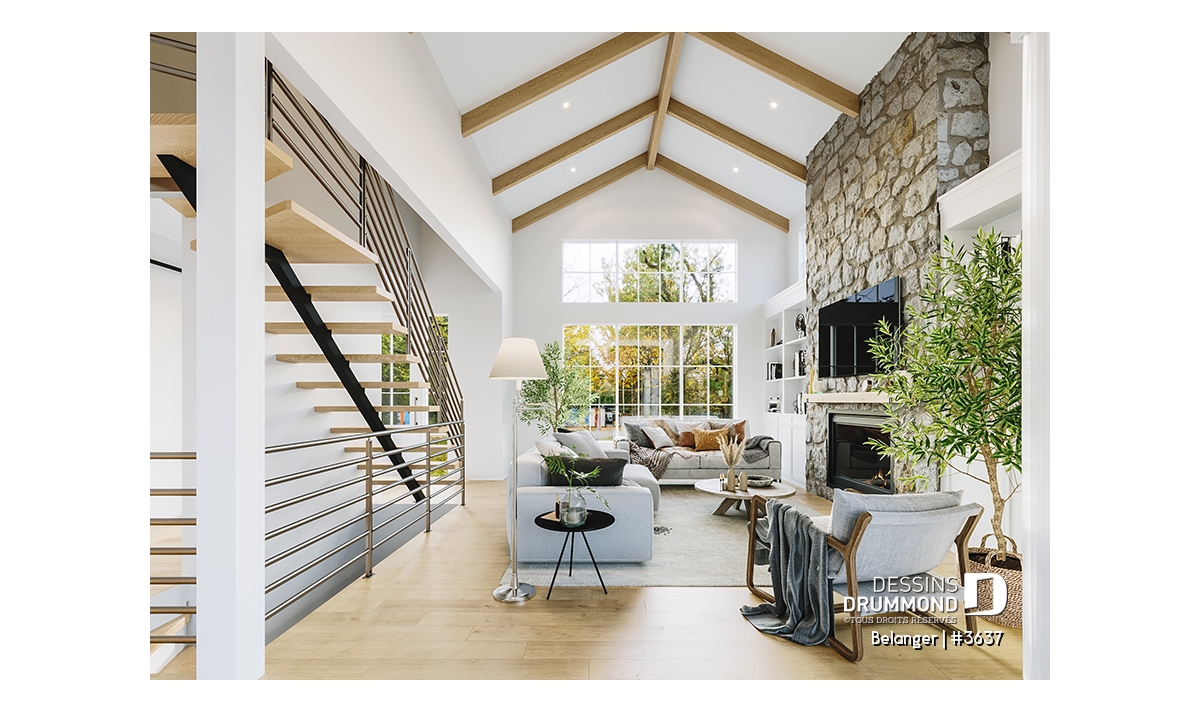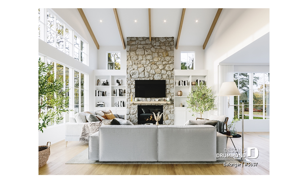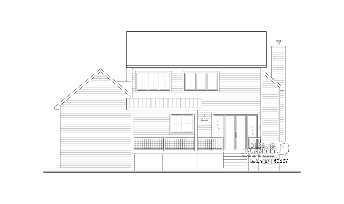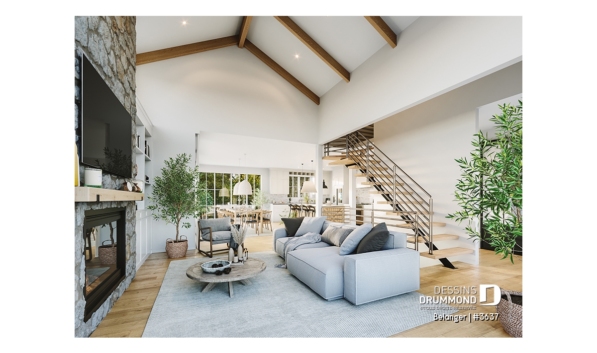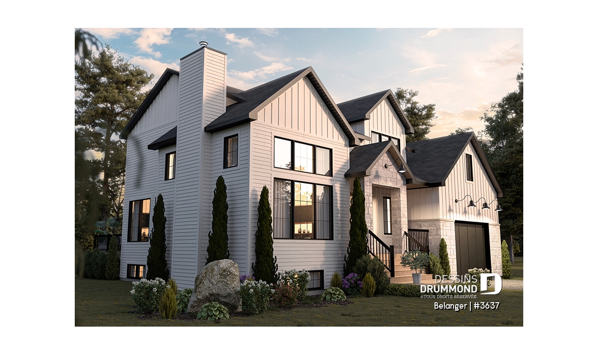 Le magnifique et spacieux plan de maison BELANGER (#3637) propose 3012 pi.ca., en plus d'un garage et d'une grande terrasse arrière partiellement abritée. À noter que les plafonds du rez-de-chaussée sont tous à 9' à l'exception du plafond de la salle de séjour qui lui est cathédrale, et à 17' de hauteur!