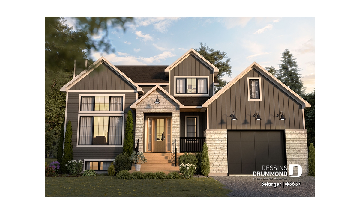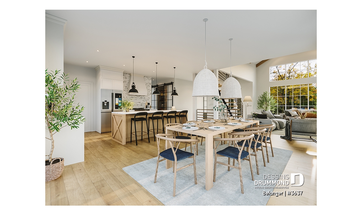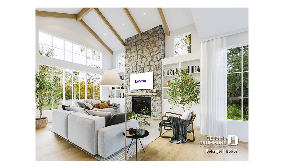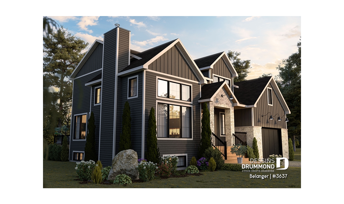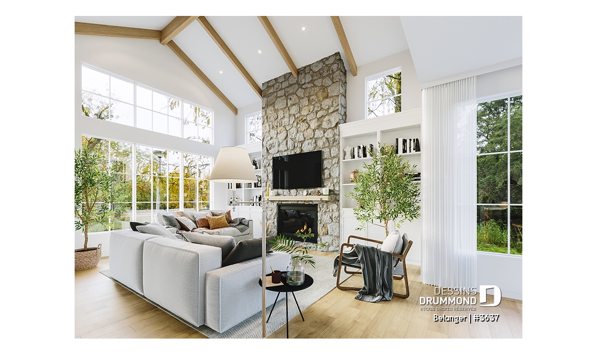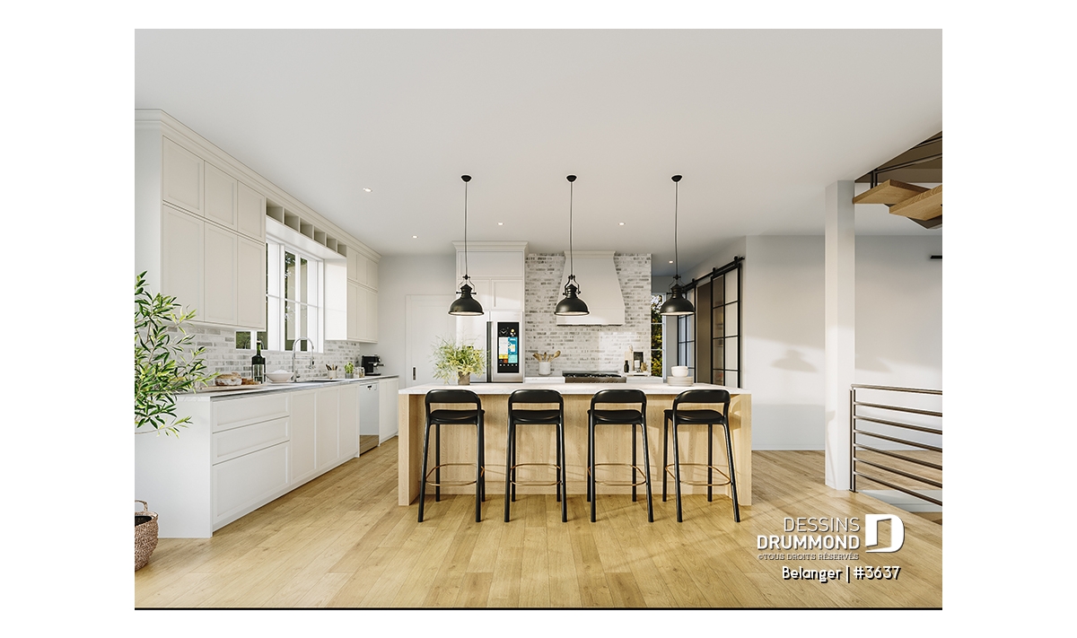 Le magnifique et spacieux plan de maison BELANGER (#3637) propose 3012 pi.ca., en plus d'un garage et d'une grande terrasse arrière partiellement abritée. À noter que les plafonds du rez-de-chaussée sont tous à 9' à l'exception du plafond de la salle de séjour qui lui est cathédrale, et à 17' de hauteur!