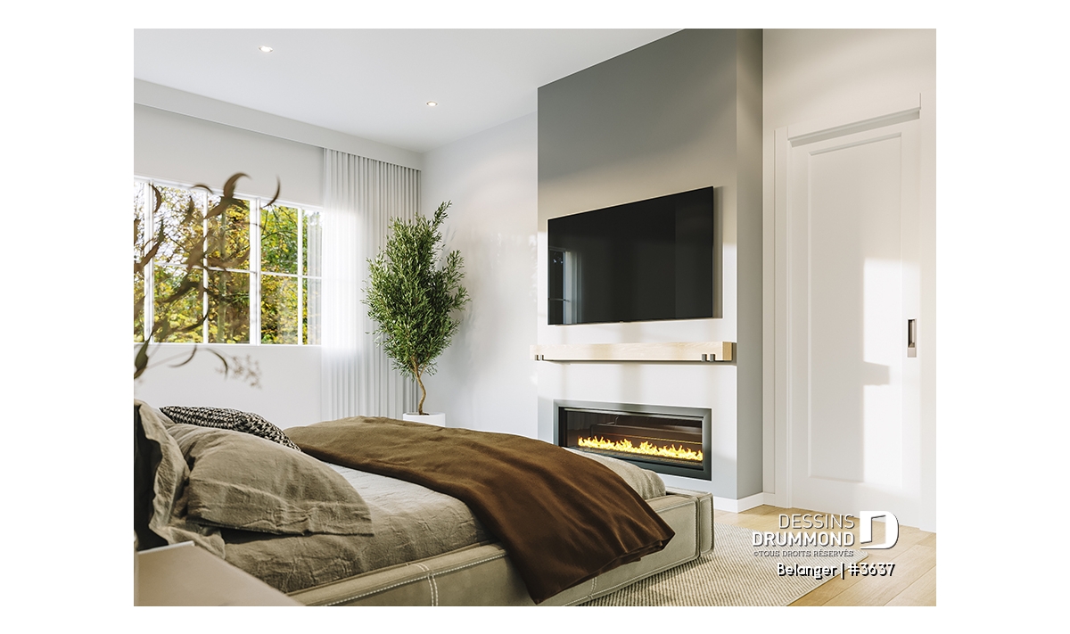 À l’étage, la suite parentale se distingue par son allure raffinée. Elle inclut une salle de bain et un très grand walk-in, parfaitement situé pour maximiser l’espace. Un bureau polyvalent est également prévu à l’étage, pouvant facilement se transformer en chambre additionnelle selon vos besoins. La fonctionnalité est au rendez-vous avec une chute à linge intégrée, reliant directement les espaces de vie à la salle de lavage.