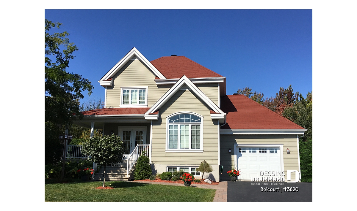 Le garage, de par sa profondeur, propose une descente au sous-sol alors qu’à l’extérieur, une galerie couverte et en forme de « L » ajoute à l’équilibre des volumes.