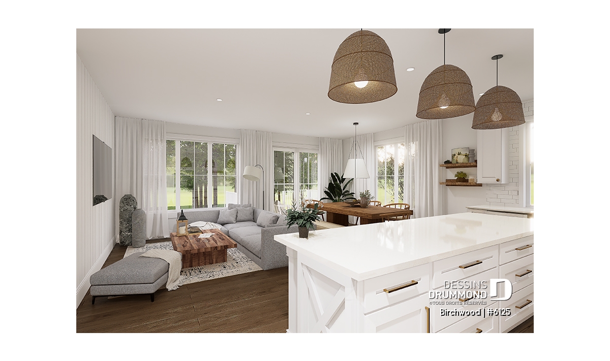 Aire ouverte au secteur cuisine, salle à dîner et salon.