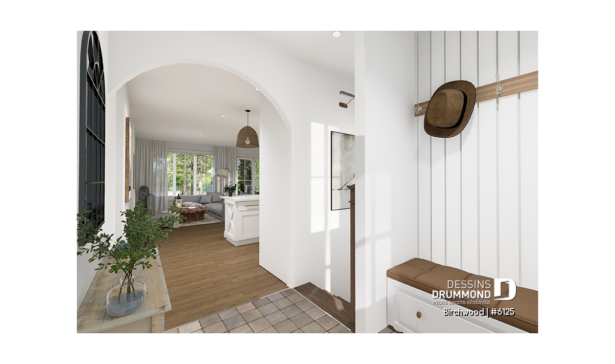 Arche architecturale entre l'entrée et la cuisine, ainsi qu'entre la salle de douche et la salle de lavage du sous-sol.