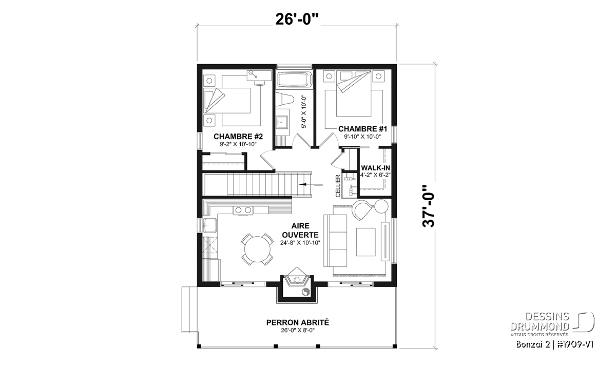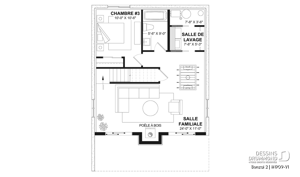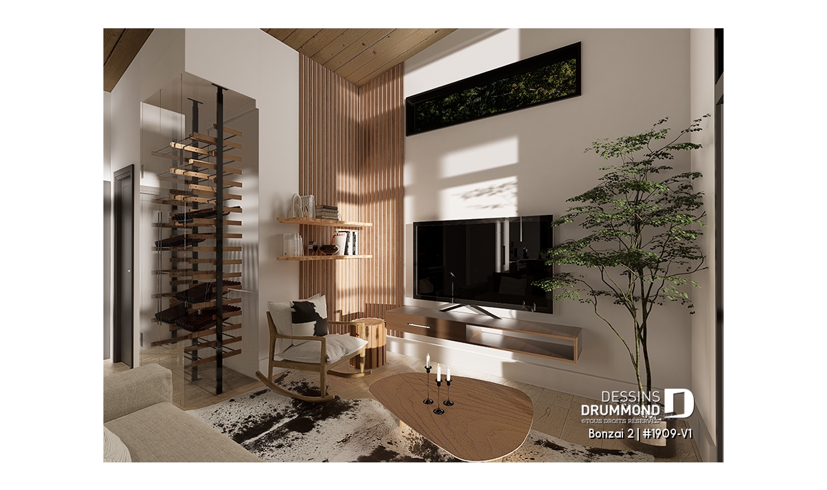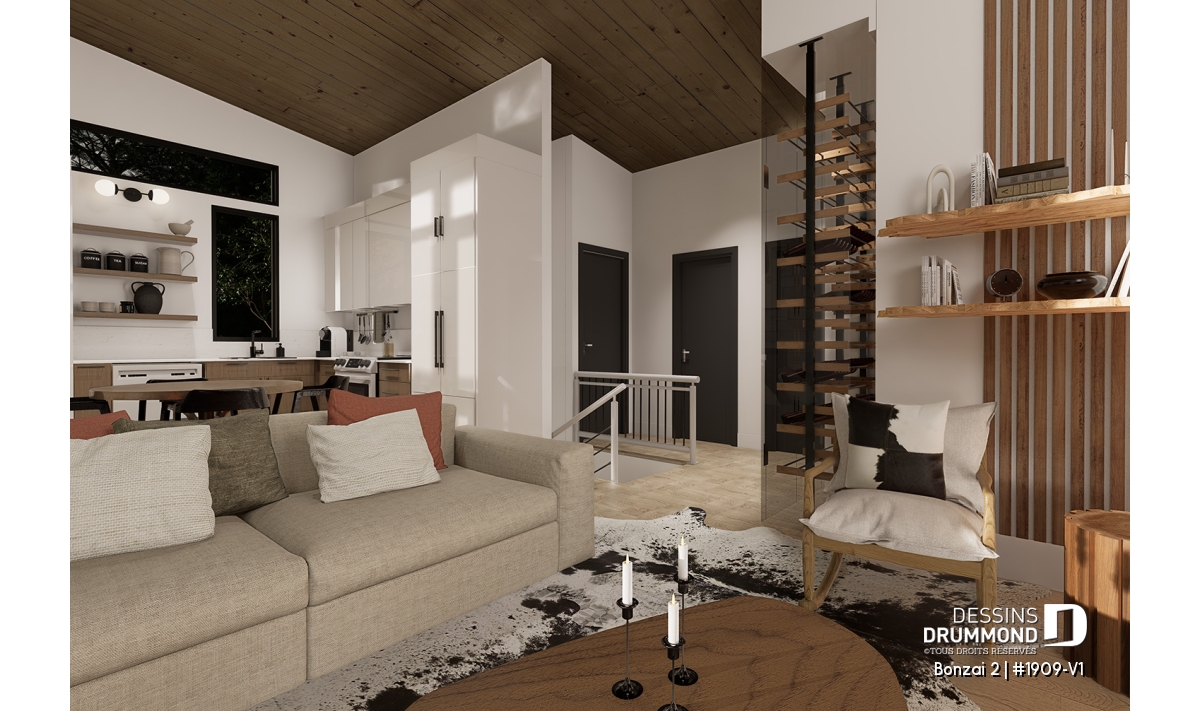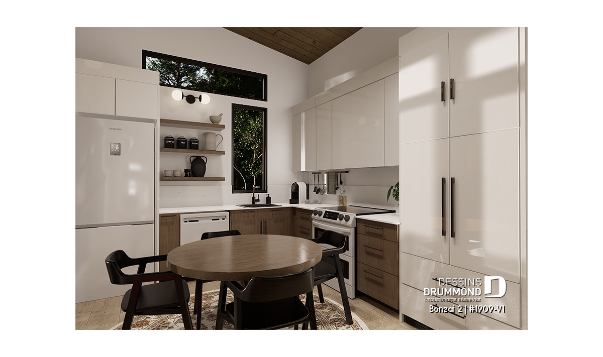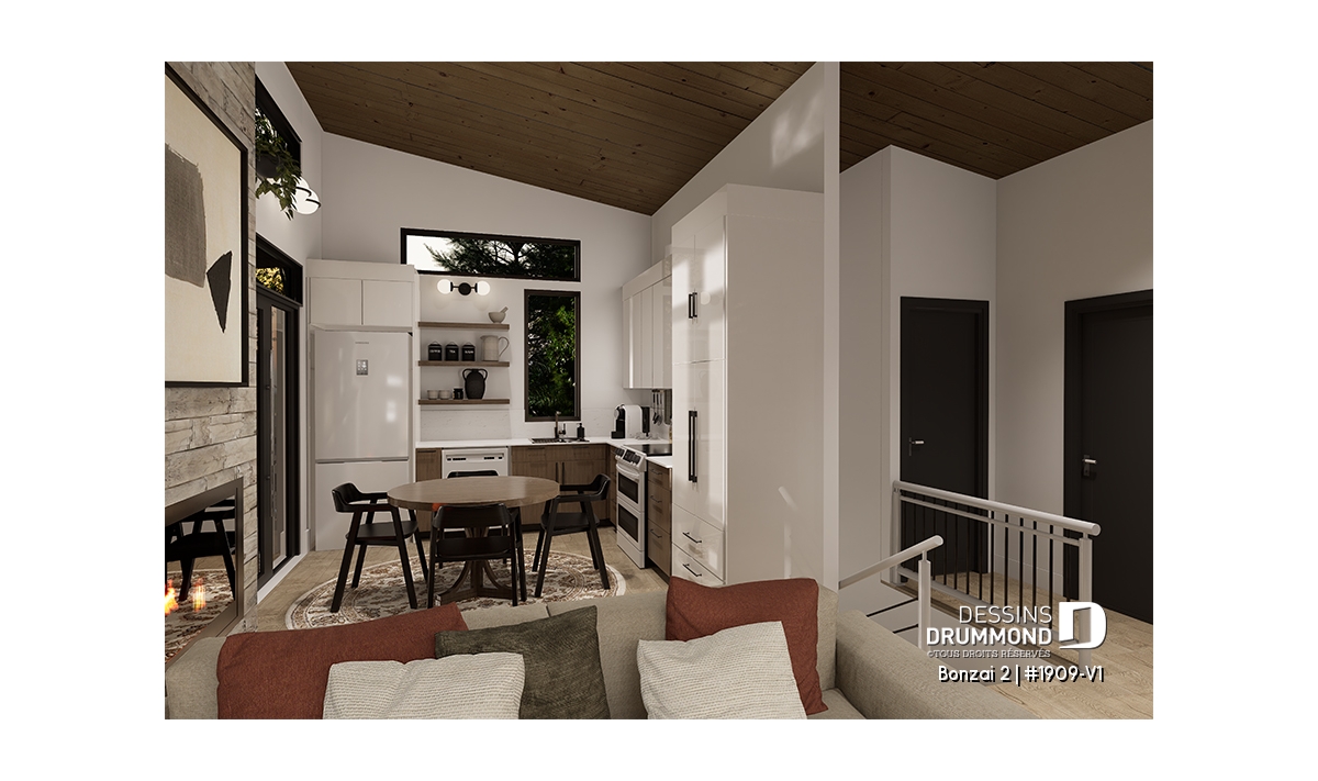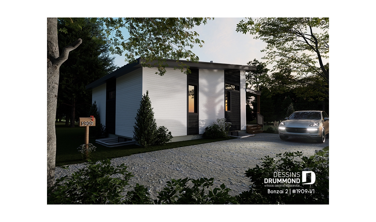 Le mini chalet BONZAI 2 (plan #1909-V1) est une version bonifiée et légèrement agrandie du modèle original BONZAI (plan #1909-BH). Il propose 764 pi² au rez-de-chaussée et le même espace au rez-de-jardin, pour un total confortable de 1 528 pi² aménagés sur deux niveaux bien pensés.