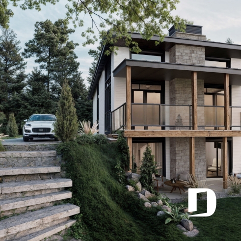 Parfaitement adapté à un terrain en bord de lac ou en montagne, ce plan met en valeur la façade arrière entièrement fenestrée, offrant une vue dégagée et une luminosité exceptionnelle. Deux terrasses abritées — une à chaque étage — permettent de profiter pleinement de l’extérieur, beau temps mauvais temps. Les aires de vie communes (cuisine, salon, salle familiale) sont toutes regroupées à l’arrière, et baignées de lumière naturelle grâce aux porte-patios.
